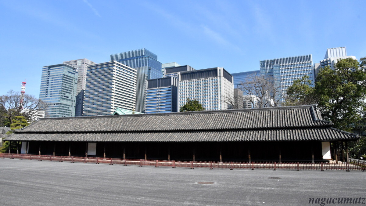 百人番所 長さ45メートルもあり、甲賀組・伊賀組・根来組・二十五騎組と言う鉄砲百人組が昼夜警備にあたっていた。各組は、20人の与力と100人の同心で構成されていた。