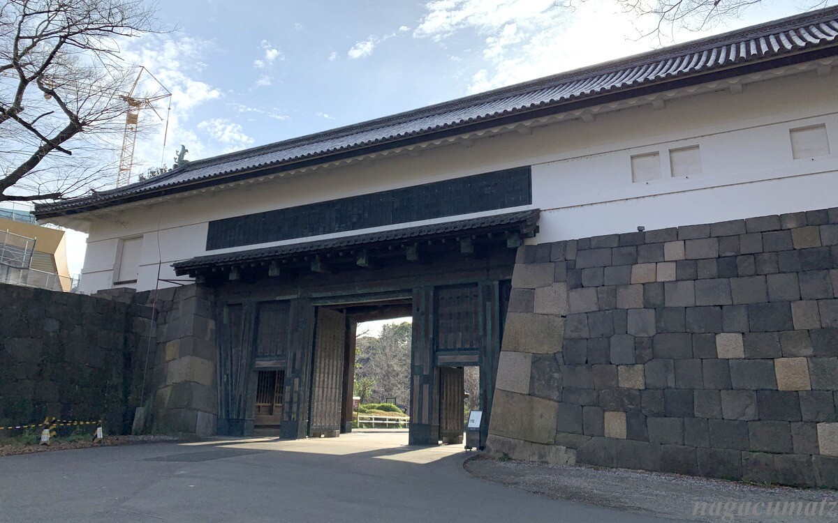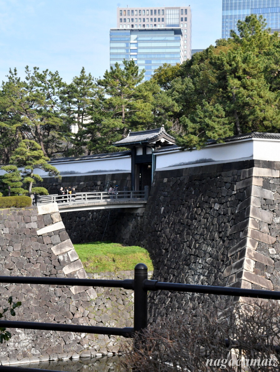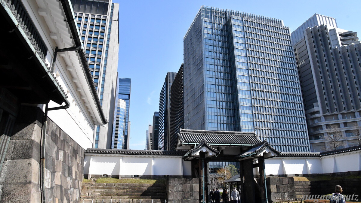 大手門から入る。大手町のビル群がすぐそばに。大手門は江戸城の正門で、諸大名がこの門から登城した。大小2つの門に囲まれた枡形は、侵入する敵を阻止・攻撃しやすい構造。大きい方の門は太平洋戦争の空襲で焼失し、昭和42年(1967年)に復元。