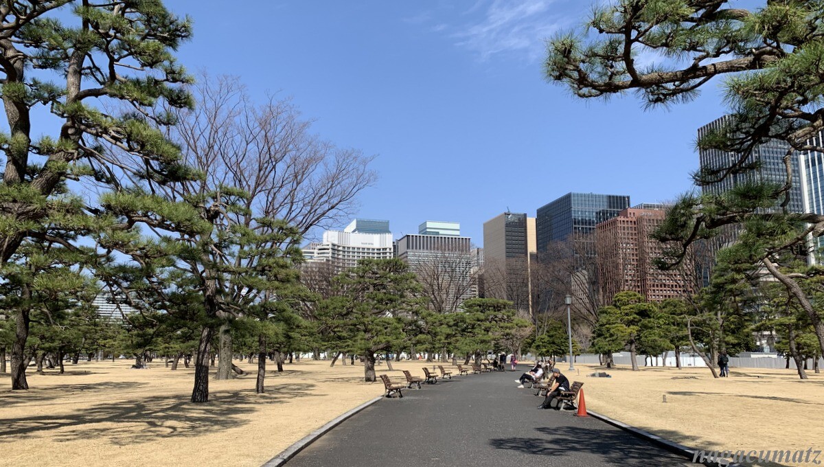 皇居外苑 暖かい日だったので、ベンチで思い思いにのんびりしている人や家族連れなどが。
