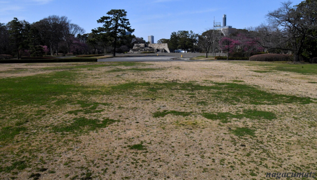 本丸大芝生 約13万平方メートルの広さ。以前は天守のあった天守台まで行けたのに(画像の一番奥の部分)、フェンスでこの奥には一切入れず!!何故?と思っていたら、令和になり、大嘗祭を行う大嘗宮がここに建てられ、今は建物は撤去されたが、未だ工事が全て終わっていない為に立ち入り禁止になっていた💦