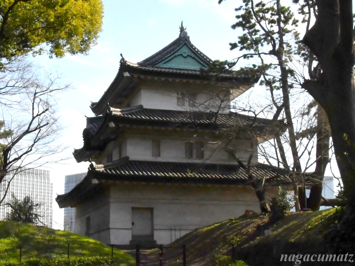 富士見櫓 高さ16メートル。櫓の下の石垣の高さは15メートル。櫓は城の隅で防御施設の役割をもっており、江戸城には多くの櫓があったが、現存する櫓は富士見櫓・伏見櫓・巽櫓の3つのみ。3重の屋根を持つ櫓としては、富士見櫓が唯一現存しているもので、どの方角から見ても美しく「八方正面の櫓」とも呼ばれていた。各階の窓は鉄砲や矢で攻め手を攻撃する為の拠点で、一階の出窓の床には石落としとして開けられるようになっているものの、江戸城は一度も敵に攻められたことがない。明暦3年(1657年)の大火で天守も富士見櫓も消失。2年後に富士見櫓は再建されるも、天守は再建されず、その後は富士見櫓が天守の代用を果たした。当時は、将軍がここから富士山や品川の海を眺めていたとのこと。富士見櫓から直線距離で富士山までは約100キロ。大正12年(1923年)の関東大震災後の修理や、昭和41年・42年(1966~7年)の修理が行われている。