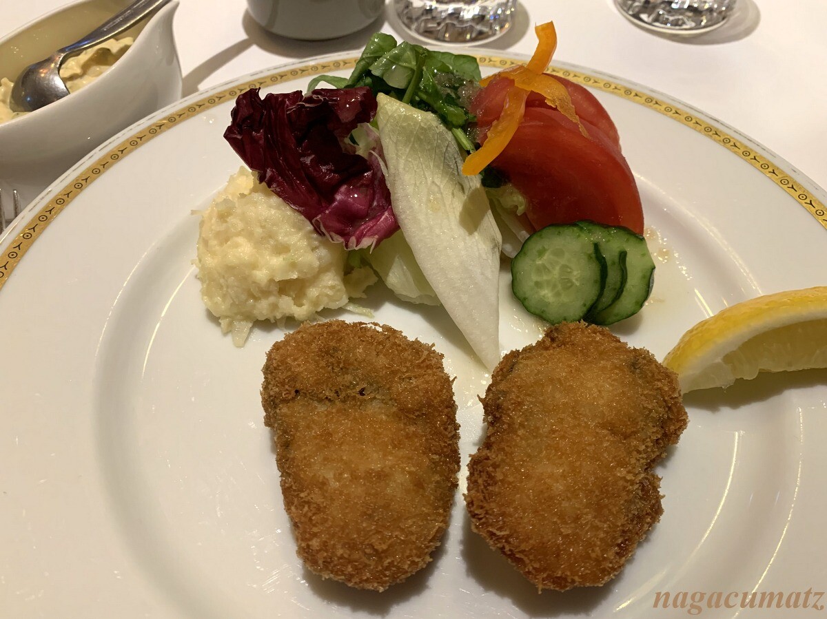 かにクロケット サラダ添え 蟹と言うよりも細く千切りされしっかり炒められたタマネギが印象的。