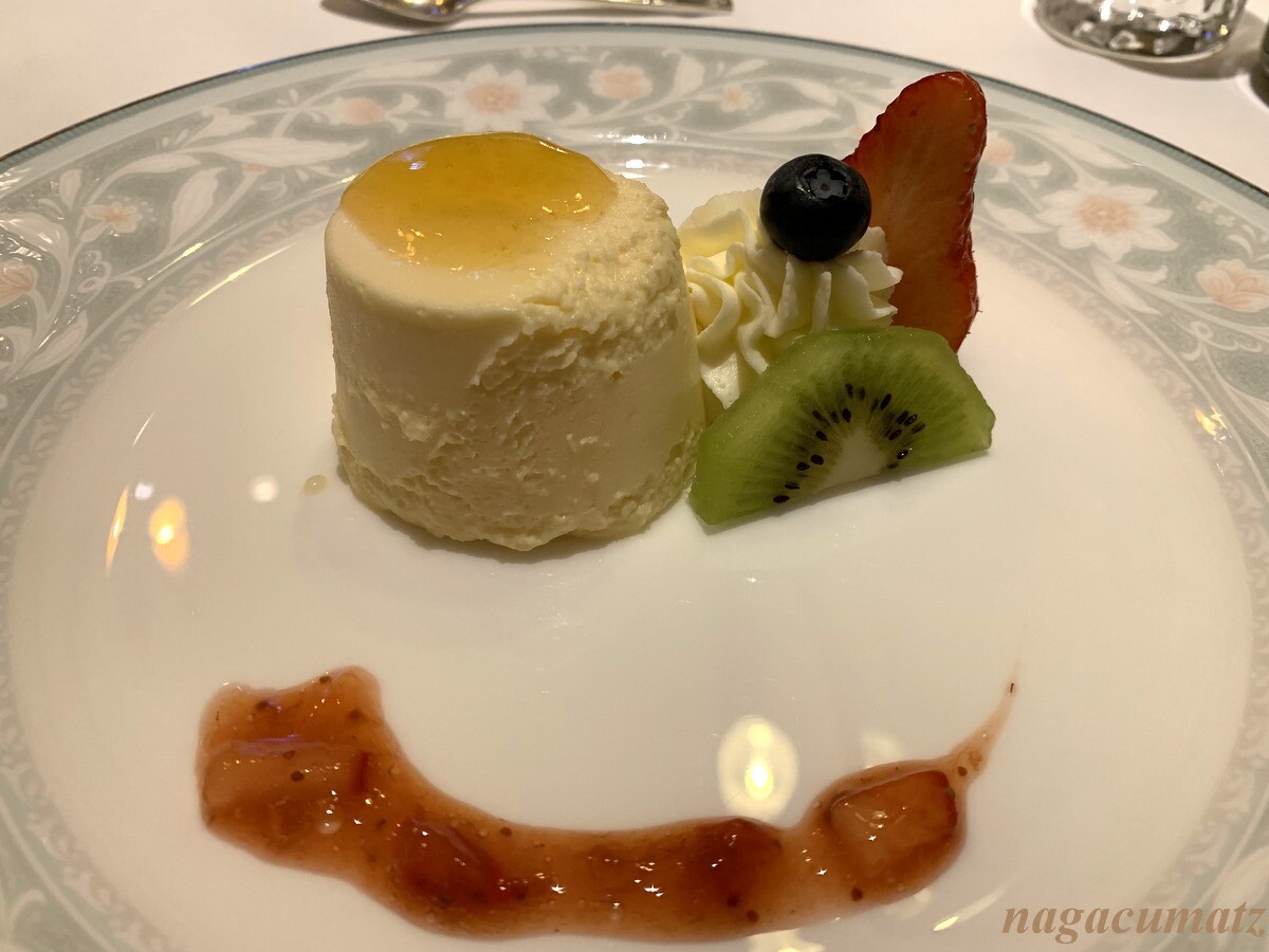 デザートはフルーツの入ったババロア。昔ながらのフルーツババロアのお味。