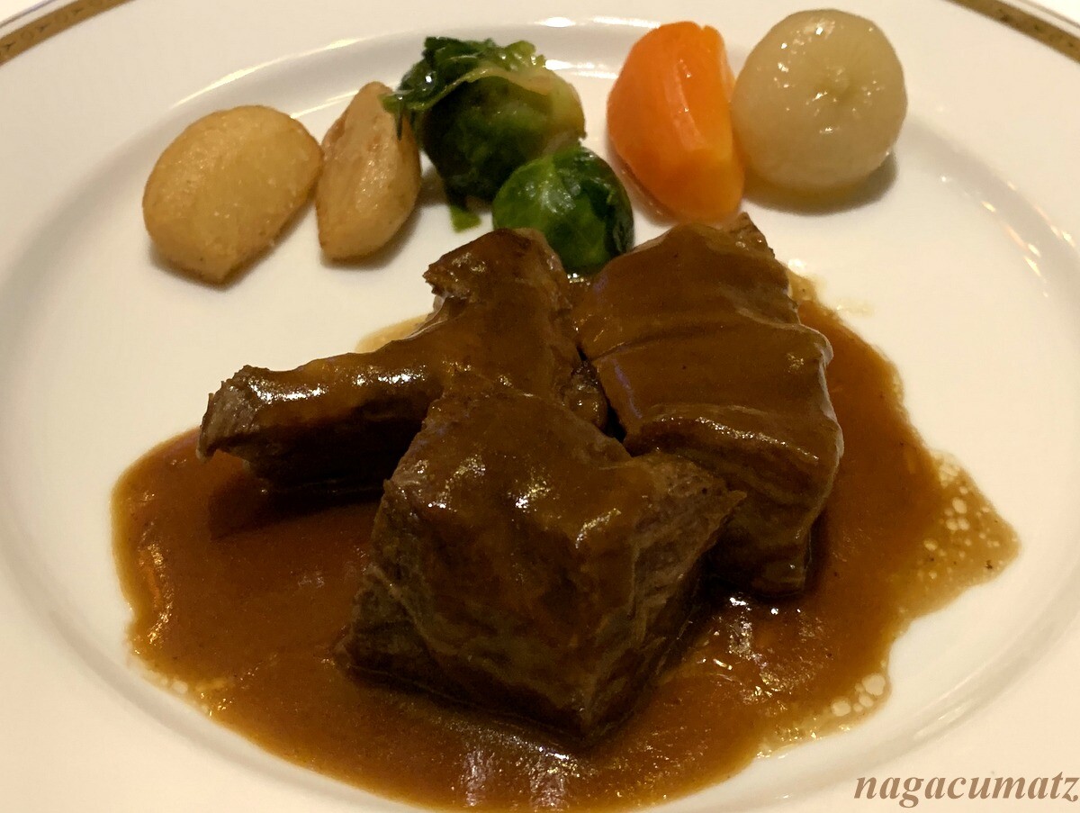 ビーフシチュー お箸で簡単に切れるが、結構脂っこくもある。付け合わせの野菜もしっかり面取りされていたり、予め下ごしらえされた人参のグラッセだったり。
