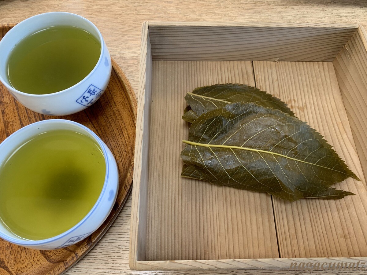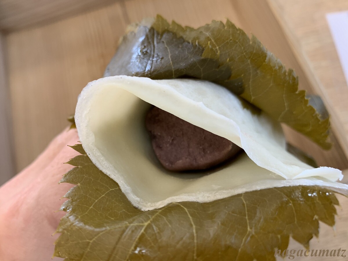 通常、桜の葉の塩漬け一枚でくるむかと思うが、ここのは一個に対して3枚の葉が使われている。このお店では、葉は取る、一緒に食べる、1枚だけ食べる、など自由にとのこと。私は桜の葉は食べる派なのだが、前回食べた時は3枚の塩漬けの葉が多い印象だったが、生地があまりにもあっさりなので、3枚もありかも知れない。