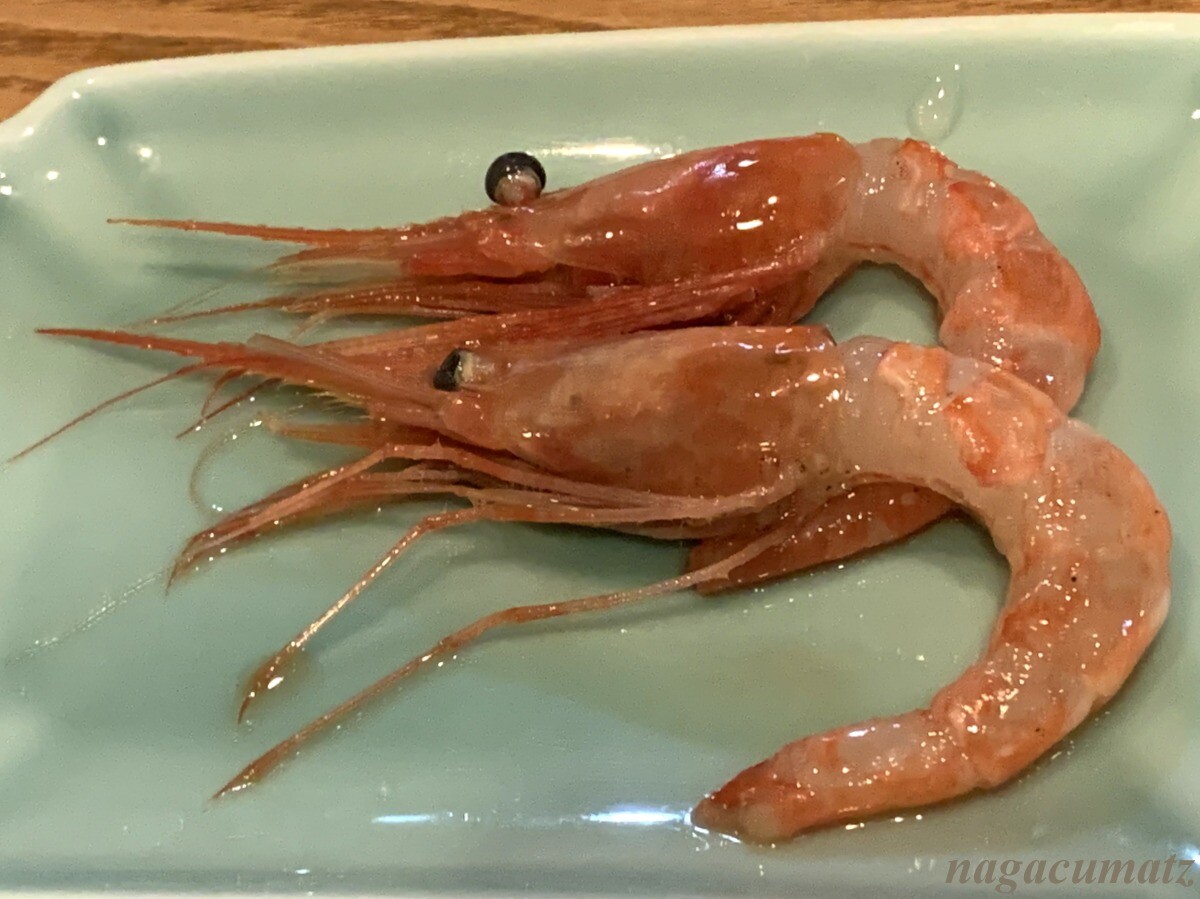 キハダマグロ(だったかな)のとろろがけイカの醤油(だったかな)で漬け込んだ甘エビ(2人分) とても甘くてこれは美味。