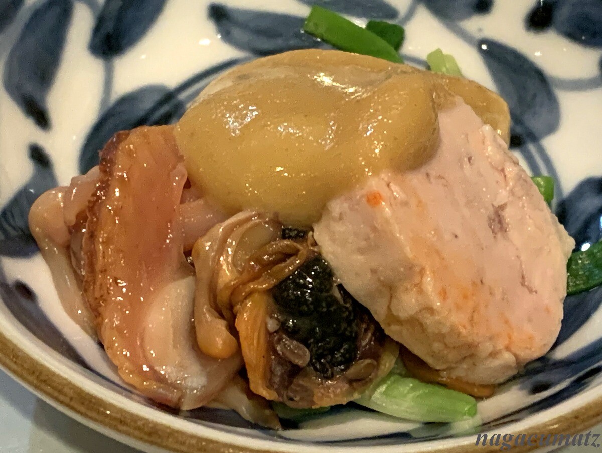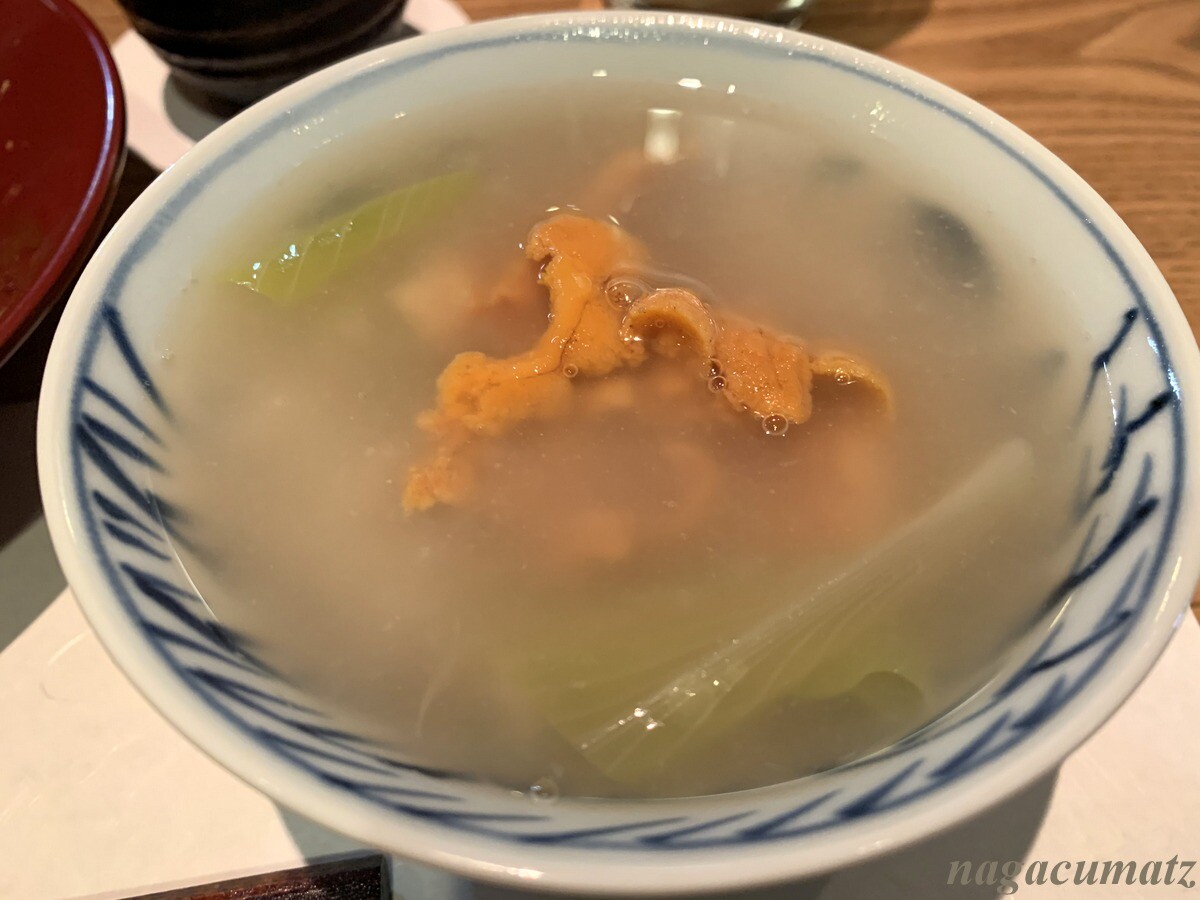 椀ものはあまりに具沢山でビックリ。蛤の上にはマグロ、筍、アスパラ、下仁田葱などが乗る。お出汁はしっかりしたお醤油味で関東だなぁと言った印象。