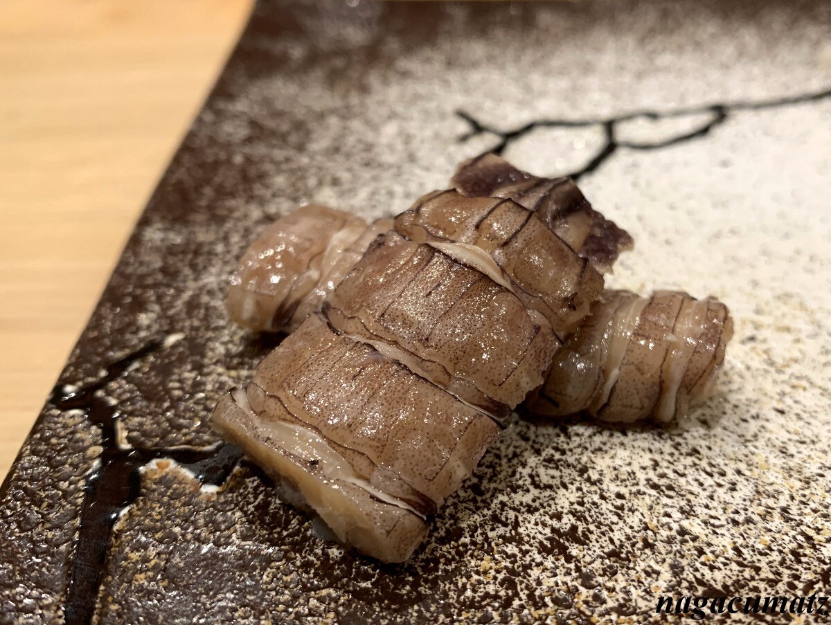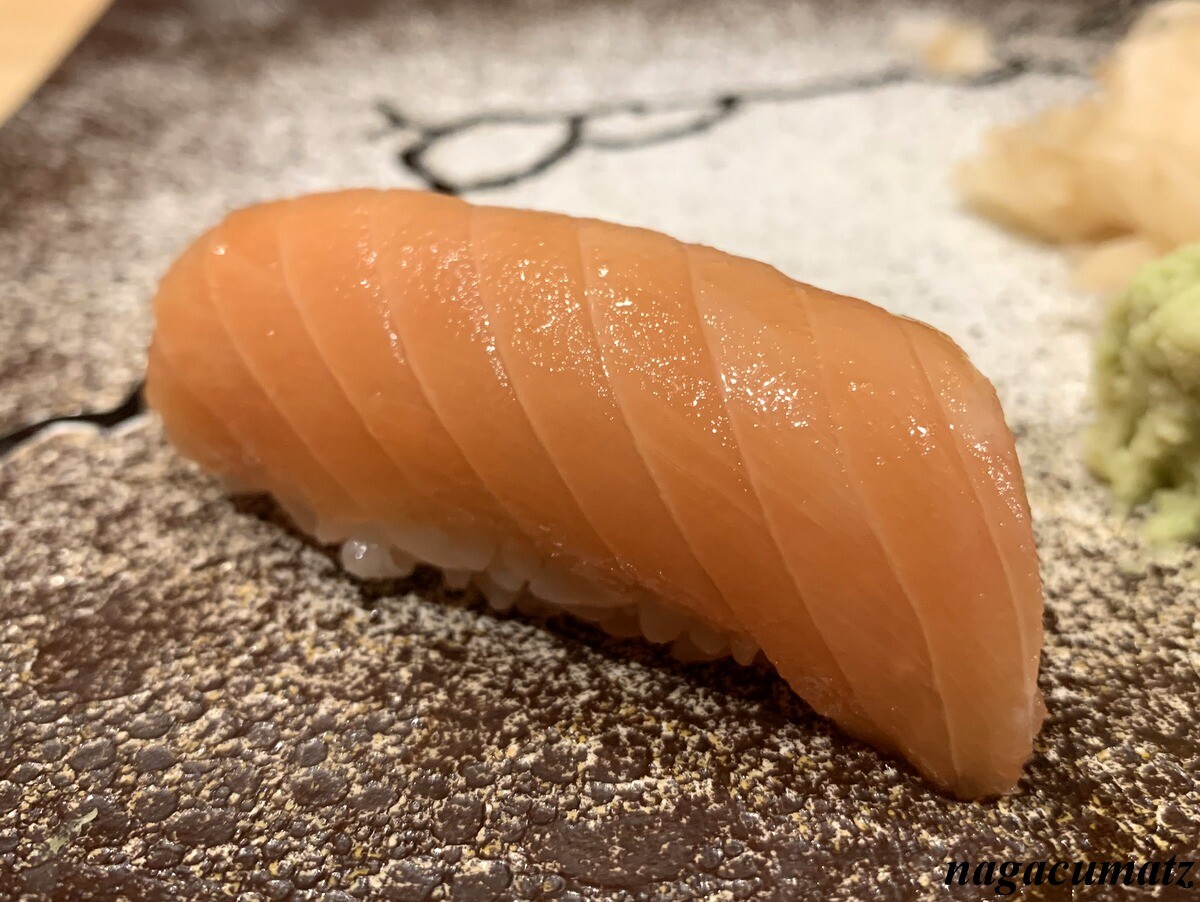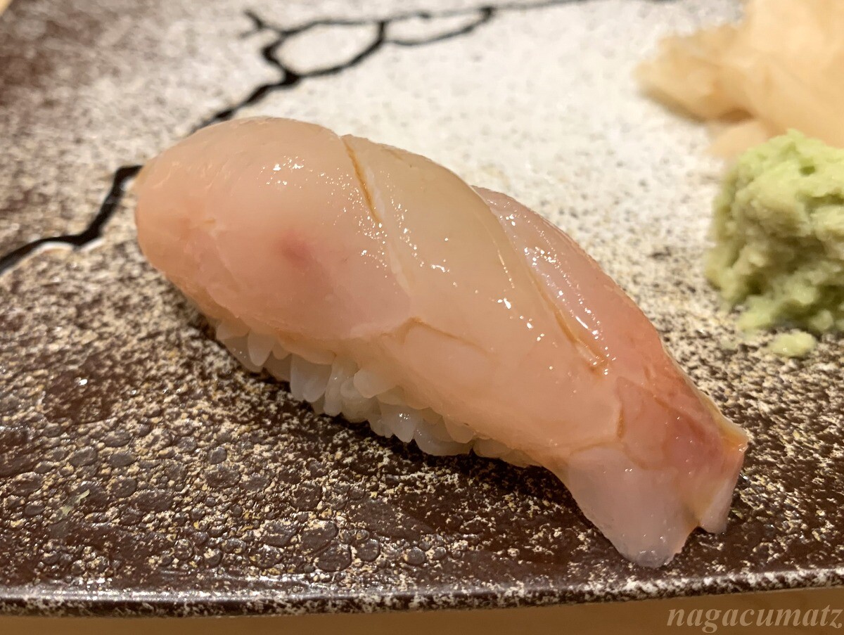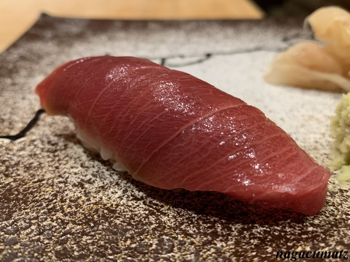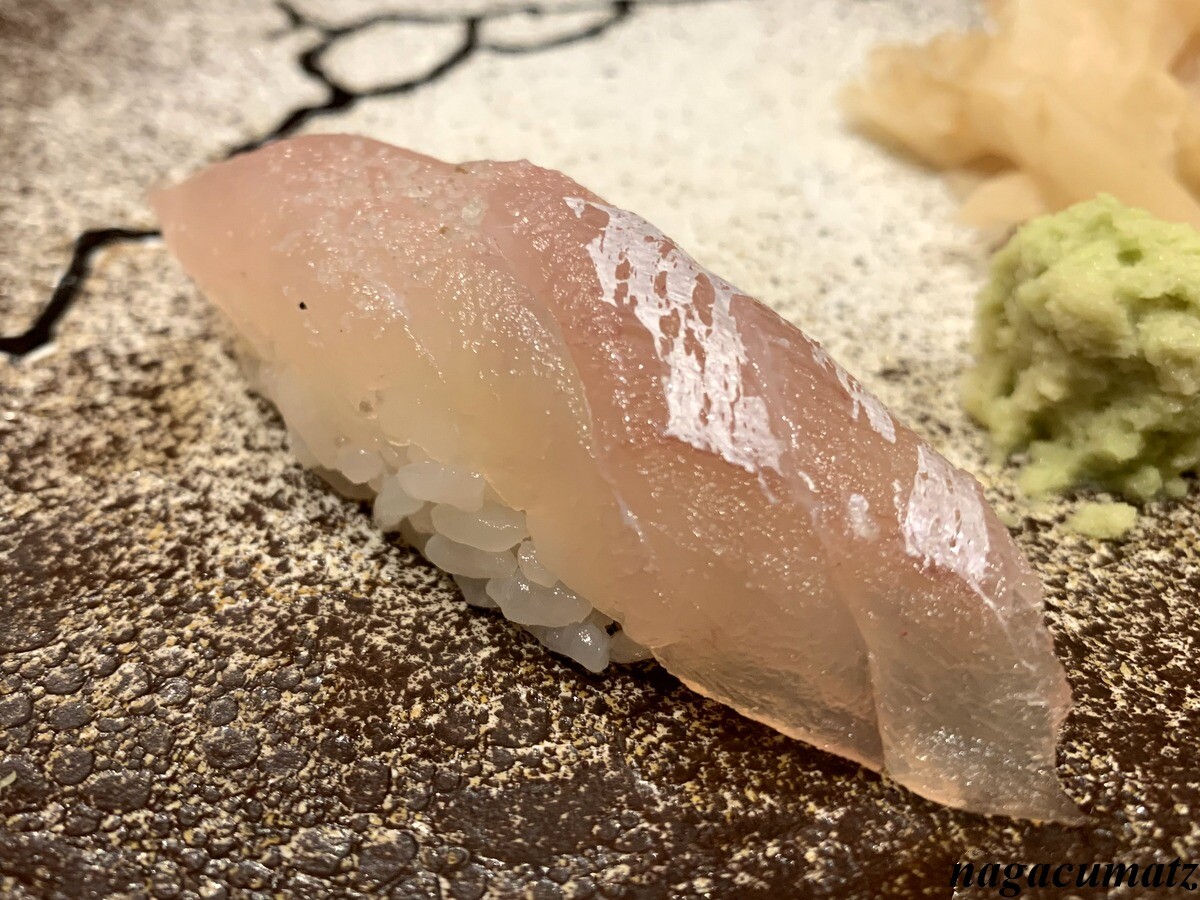 シャリが美味しい。お米は、福井県美浜町の農家に専用のお米を作ってもらっておられる。苗の間隔を広くすることで大粒なお米が採れ、甘みが増す為、赤酢と塩しか加えておられないそうだが、甘みがある。しゃりの温度とねたの温度を合わせる為、ねたを少し前に切り出しておられた。