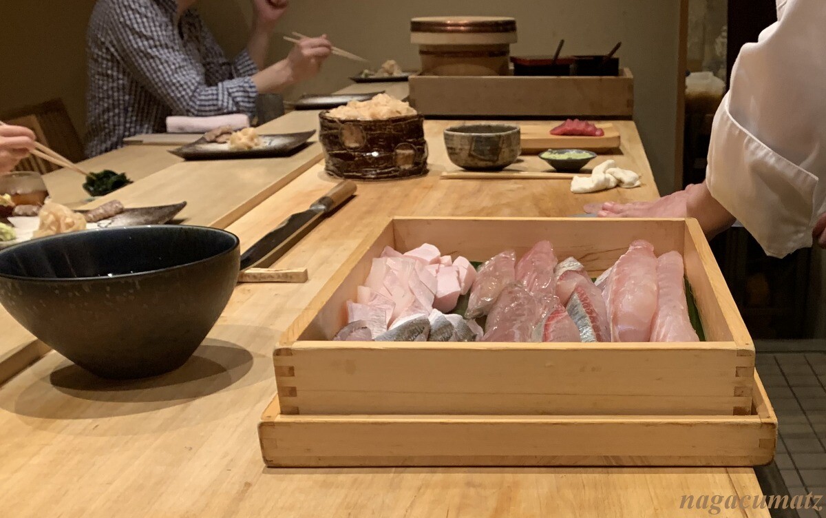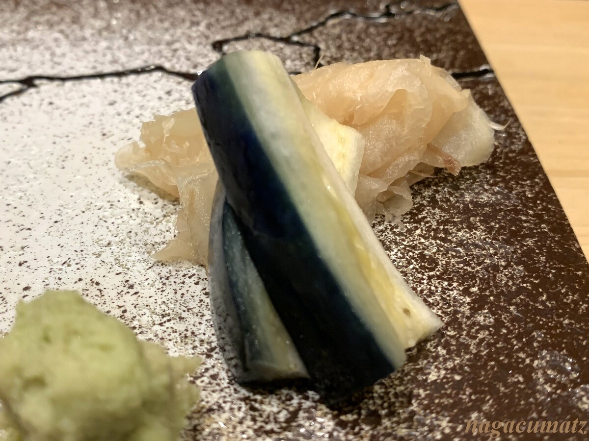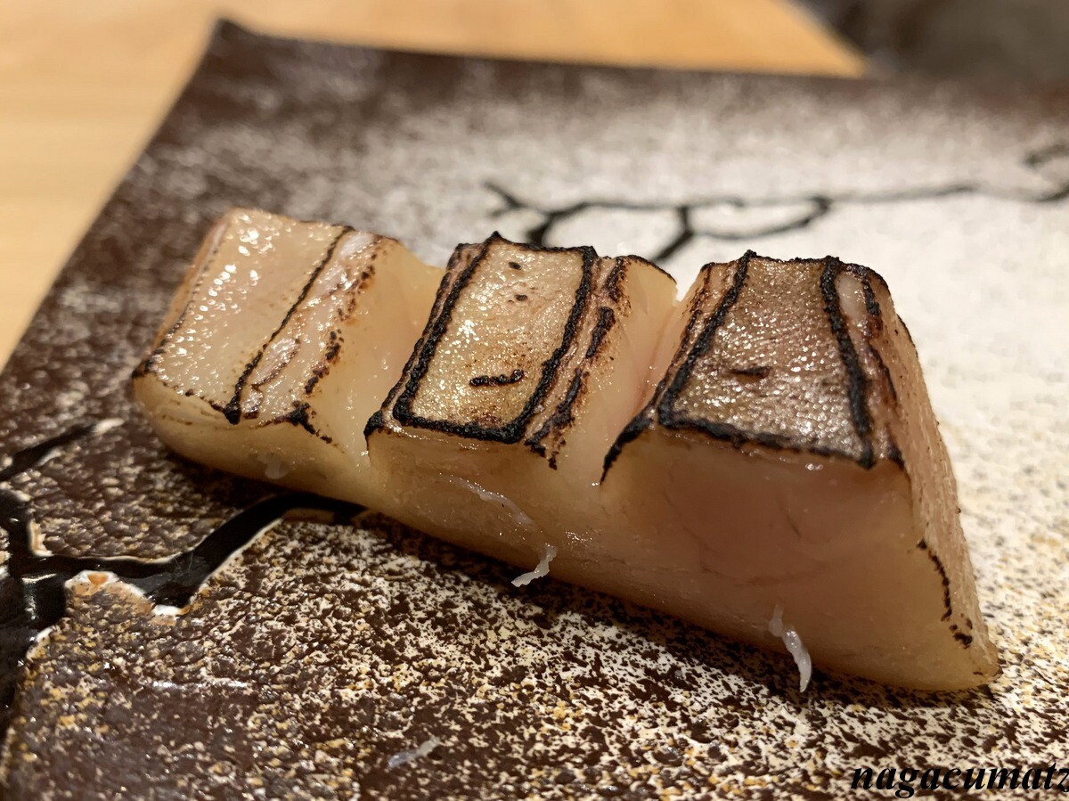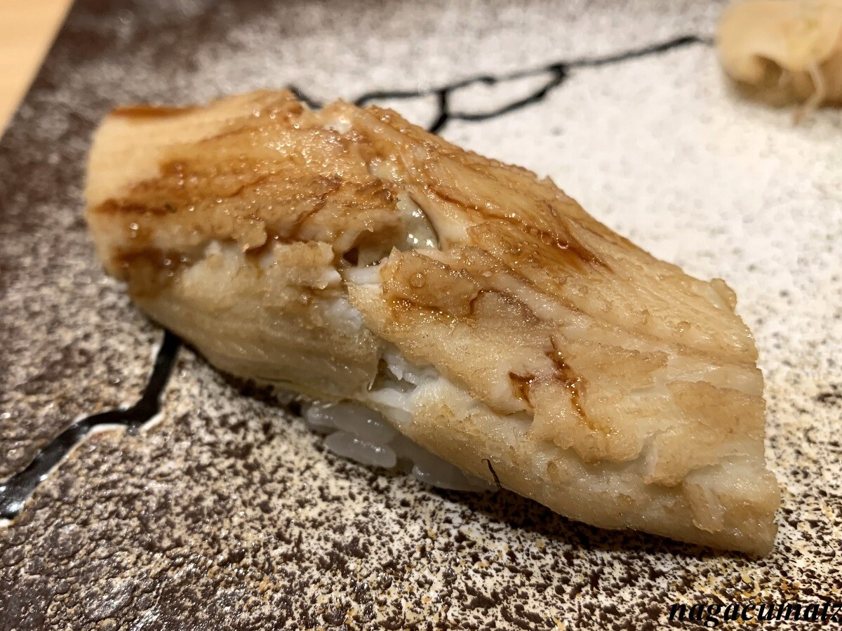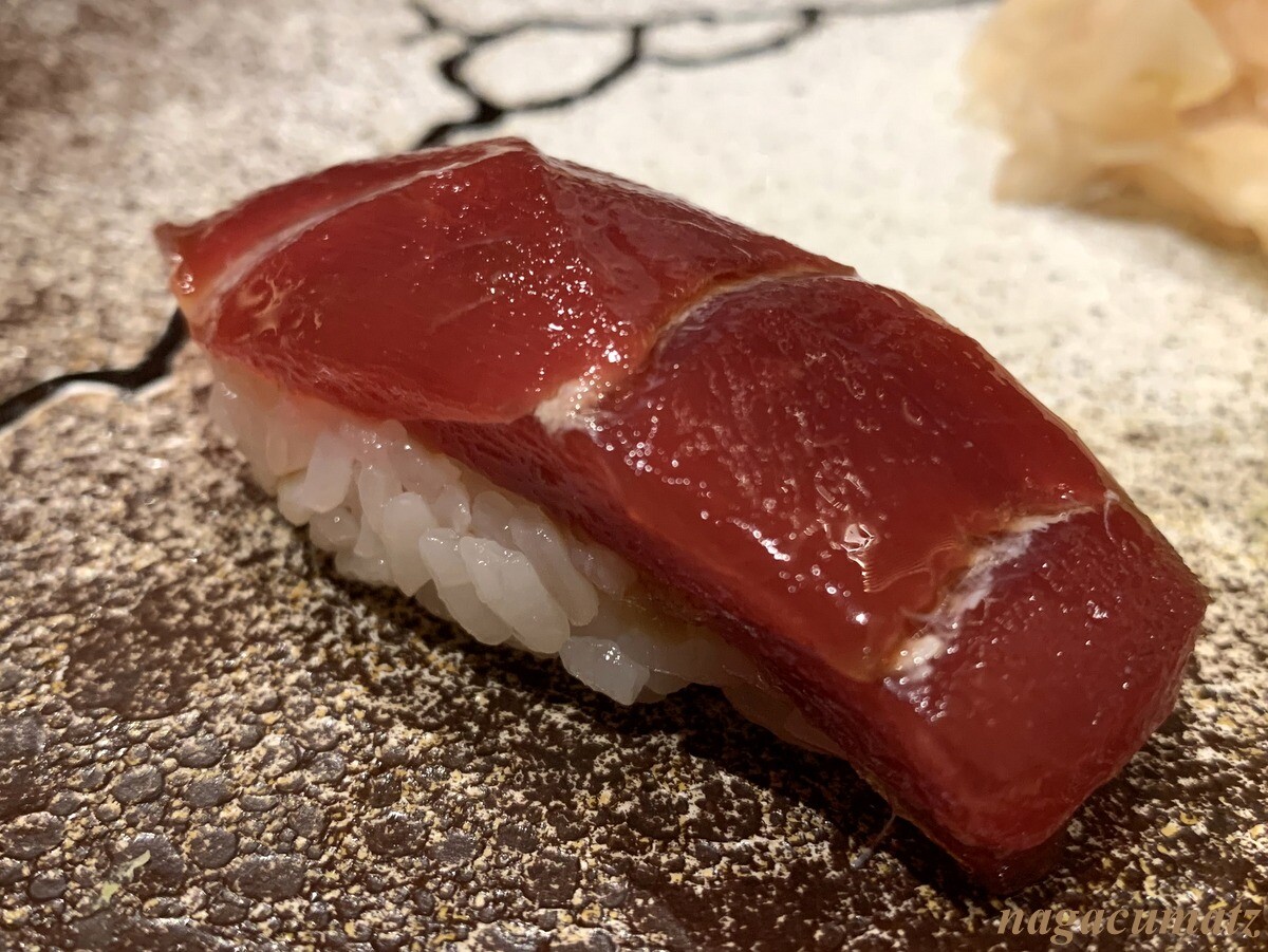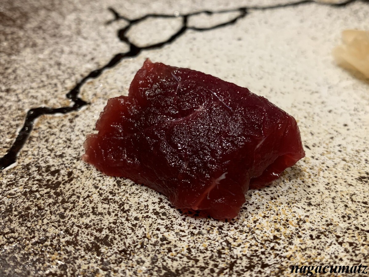 シャリが美味しい。お米は、福井県美浜町の農家に専用のお米を作ってもらっておられる。苗の間隔を広くすることで大粒なお米が採れ、甘みが増す為、赤酢と塩しか加えておられないそうだが、甘みがある。しゃりの温度とねたの温度を合わせる為、ねたを少し前に切り出しておられた。