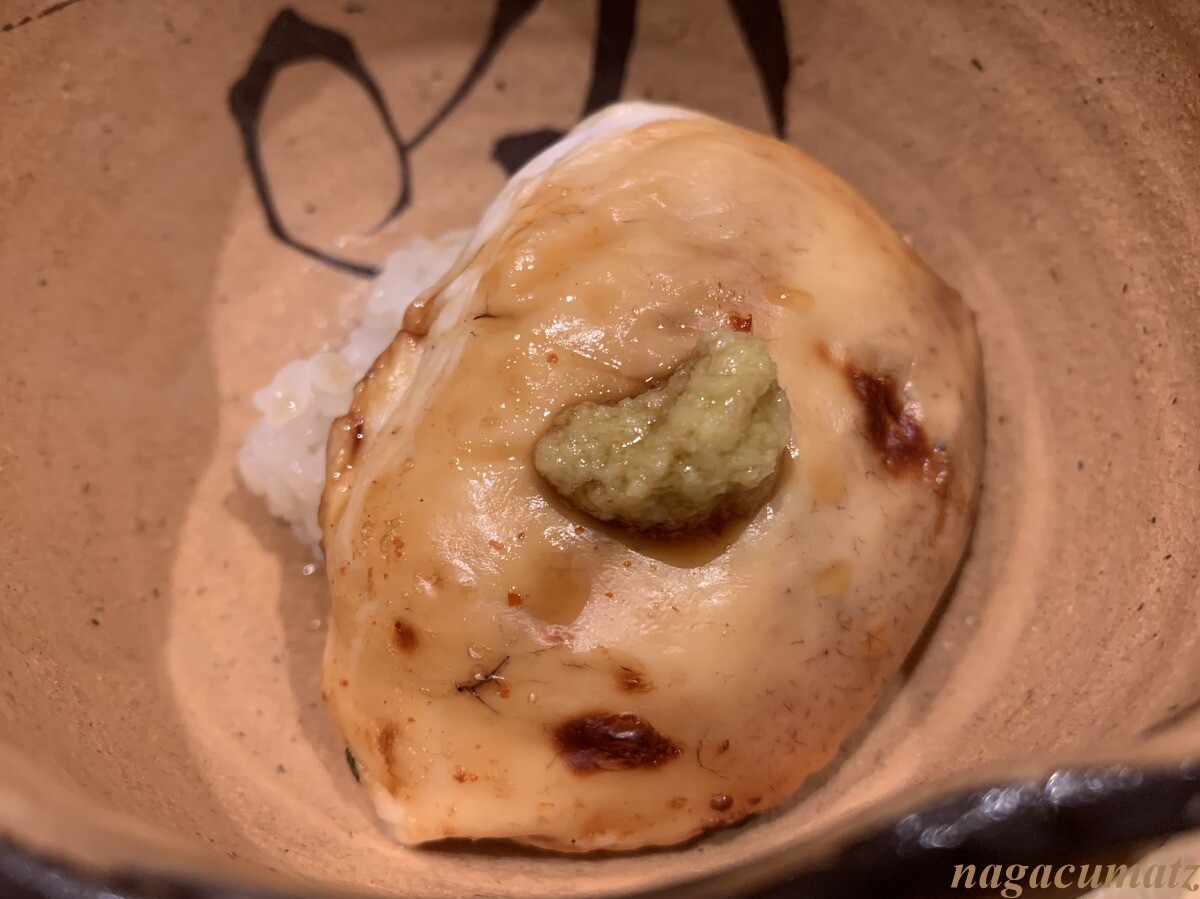 お醤油と七味がふられたまふぐの白子焼き とろとろな白子を崩して、下のご飯と合わせる。とても美味。