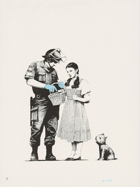●「ストップ・アンド・サーチ」権力行使には、自由と公共の安全との境界線はどこにあるのかと。2007年500枚のスクリーンプリントに青のクレヨンでサインしている。オズの魔法使いのドロシーと、誠実と信仰のシンボルの犬であるトトが描かれている。