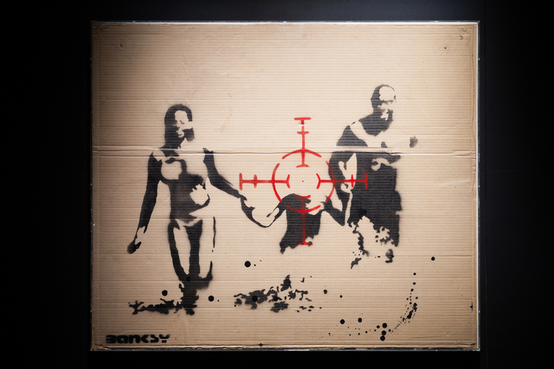 ●「ファミリー・ターゲット」2003年 子供に照準が当たっている。家庭を築いて子供を持つことが一番とすることへの疑問、バンクシーは病気以外のなにものでもない、世界の不正や悪事が子供達に影響を与える、、、などさまざまな解釈や解説がされているとのこと。段ボールに描かれているとはビックリだった。