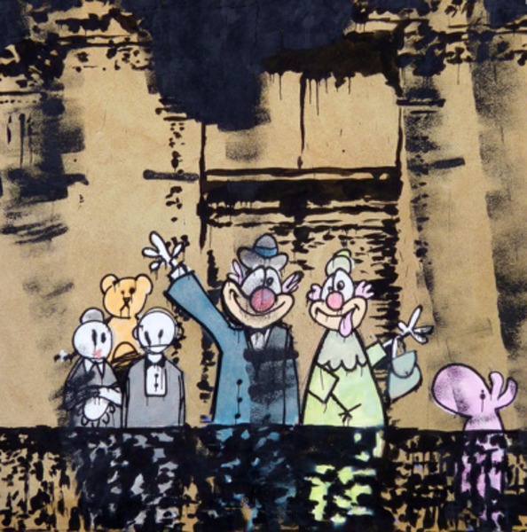 ●「ベリー・リトル・ヘルプス」薬局の壁にあったもので、版画はこの反転。薬局の壁画では子供のひとりは独占小売り企業のテスコのビニール袋をかかげており、版画ではイギリスの国旗のパンツとなっている。