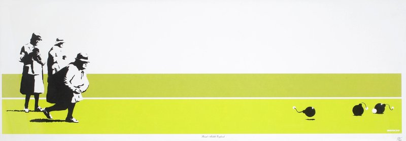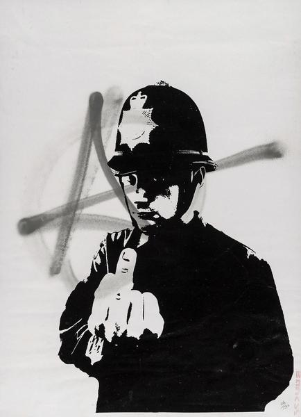 ●「ボム・ミドル・イングランド」初期作品。アクリル絵の具とスプレーで描かれた。2007年サザビーズで102000ポンドで落札。