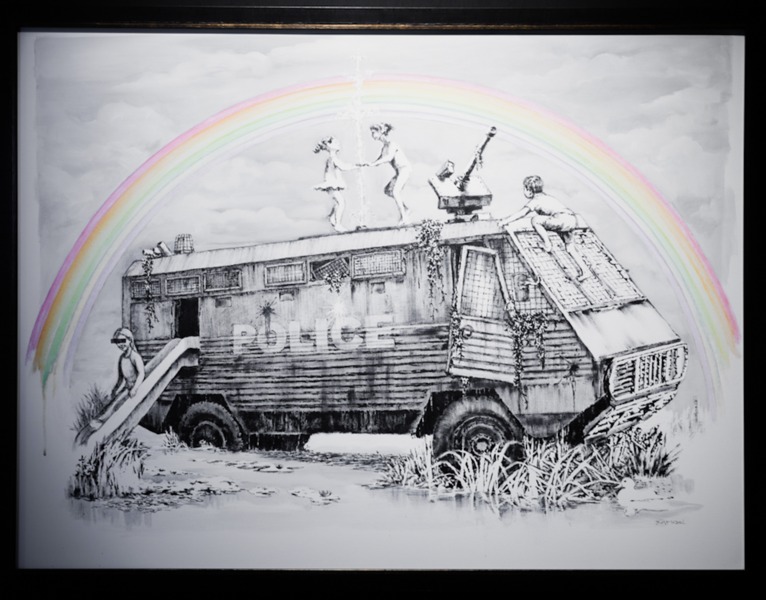 ●「バッド・ミーニング・グッド 悪こそ善なり」シリーズとなっており、機関銃がスニーカーを履いているもの、軍用車にリボンとウサギの耳が描かれたもの、パトカーに車輪やタイヤがないもの、カラスに襲われる監視カメラなどがある。