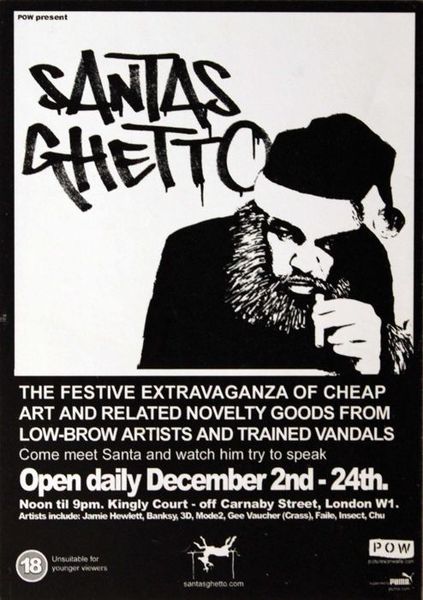●「フラッグ」2006年、アンダーグラウンド・アーティストのグループがロンドンのオックスフォード・ストリートで「サンタズ・ゲットー」というキャンペーンを実施。世界的なアーティスト30人の作品が手頃な価格で販売された。バンクシーは、販売用としてこの作品をゴールドとシルバーの色違いで制作。これまでストリートで描かれたことのないもので、最初の版画シリーズは2006年に発売され、「ゴールデン・エディション」はベツレヘムでの「サンタズ・ゲットー」の開催初日に合わせて2007年に発売された。2つの作品で合計6万ポンドを売り上げ、その半分は眼科治療を専門とする病院へ、残りの半分は難民センターを運営する団体へ寄付された。