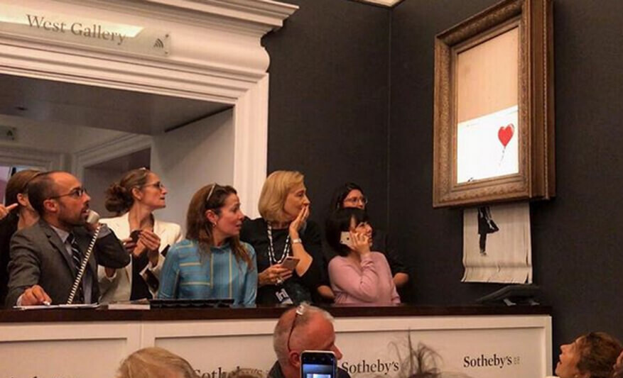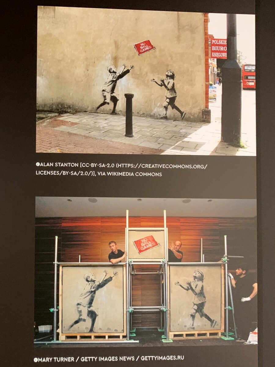 ●「ノー・ボール・ゲームス」2009年にロンドンで、2人の子供が「ノー・ボール・ゲームス(球技禁止)」と書かれた標識で遊んでいる姿を描き、政府は保存の為に作品を保護ガラスで覆った。しかし、2013年にこの作品は「ザ・シンクラ・グループ」という会社が、作品を剥ぎ取って3つの部分に分け3部作にした。しばらくして彼らは「スティーリング・バンクシー」展を開き、プライベート・コレクションのバンクシー作品を展示。この会社ともこの展覧会とも、バンクシーは何の関わりもなかった。下段の写真は、この作品が売却されたオークションの様子。
