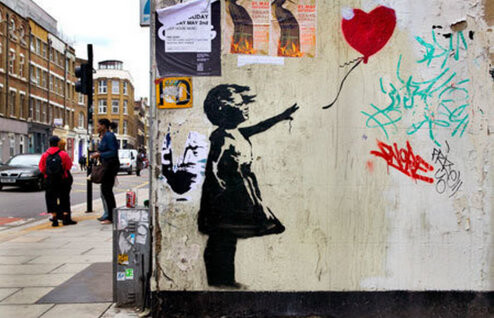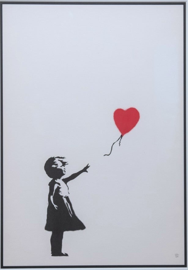 ●「ガール・ウィズ・バルーン」2002年、ロンドンのウォータールー橋の階段に描かれた壁画。「THERE IS ALWAYS HOPE. 希望はいつもある」と言う文言は誰かに書き足されたもの。今は塗りつぶされてオリジナルの壁画は残っていない。2018年、オークションで104万ポンドの値段が付いたとたん、シュレッダーで切られていく映像は記憶に新しい。絵は半分ほど切られた状態で止まったが、バンクシーがその直後に額縁にシュレッダーを仕込む様子などの動画を公開してリハーサルではうまくいったのにと。落札者はヨーロッパの女性で、美術史に残る作品になったとしてそのまま購入。「Love