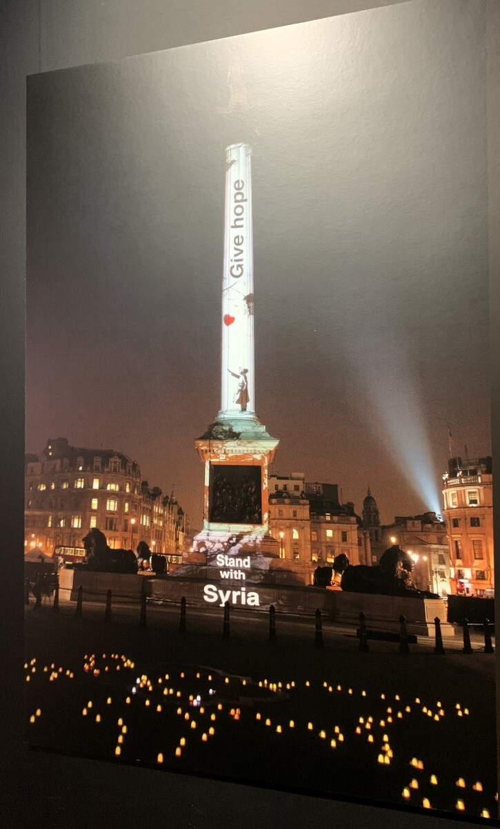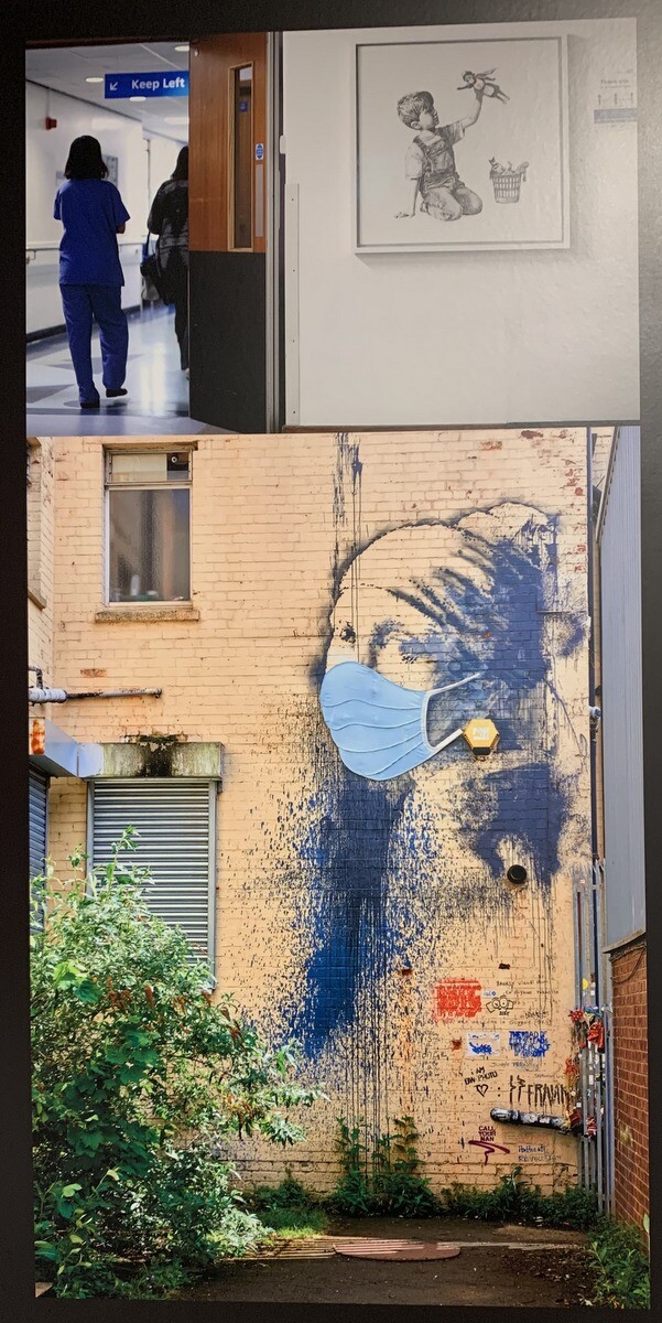 最近のバンクシーの作品としては、この上の画像。スパイダーマンやバットマンなど数あるスーパーヒーローを捨て置いて、看護師の格好の人形を選んでいる男の子の絵。「ゲーム・チェンジャー」と名付けて、イギリスの病院に送った。今年の秋まで病棟に展示され、その後は国民保護サービスの資金集めの為にオークションにかけられる予定とのこと。