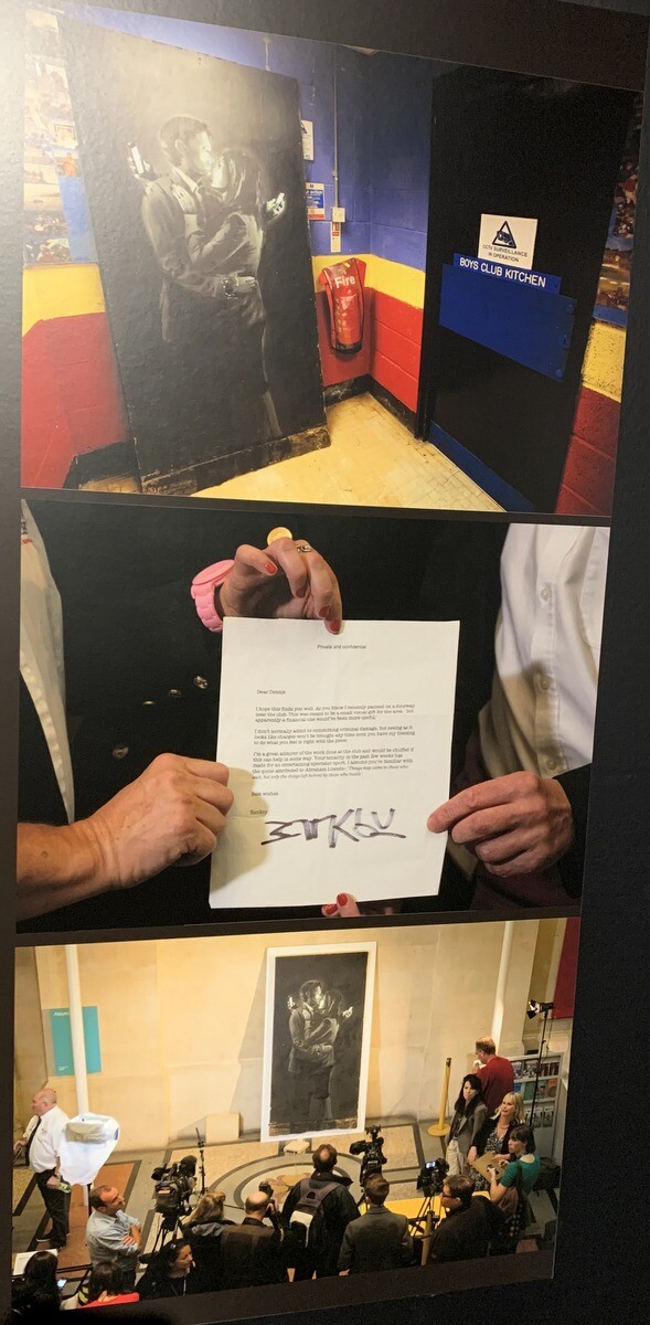 ●「モバイル・ラバーズ」2014年ブリストルの若者支援センターのドアに描かれた。支援センターのディレクターは作品の盗難を恐れて、廊下に移して一般公開。破産寸前だったセンターはバンクシーの作品の拝観料を取る。しかし市議会は作品が市の財産であると主張し警察が没収。ブリストル美術館に展示。バンクシーはこの絵が彼の作品であると証明する手紙をディレクターに送り、「あなたがこの作品について正しいと思うことをして下さい」と書いた。作品はオークションにかけられ収益金はセンターに贈られることになったが、その日からディレクターは殺人予告を受けるようになってしまった。オークション後、40万3000ポンドで個人コレクターに売却された。
