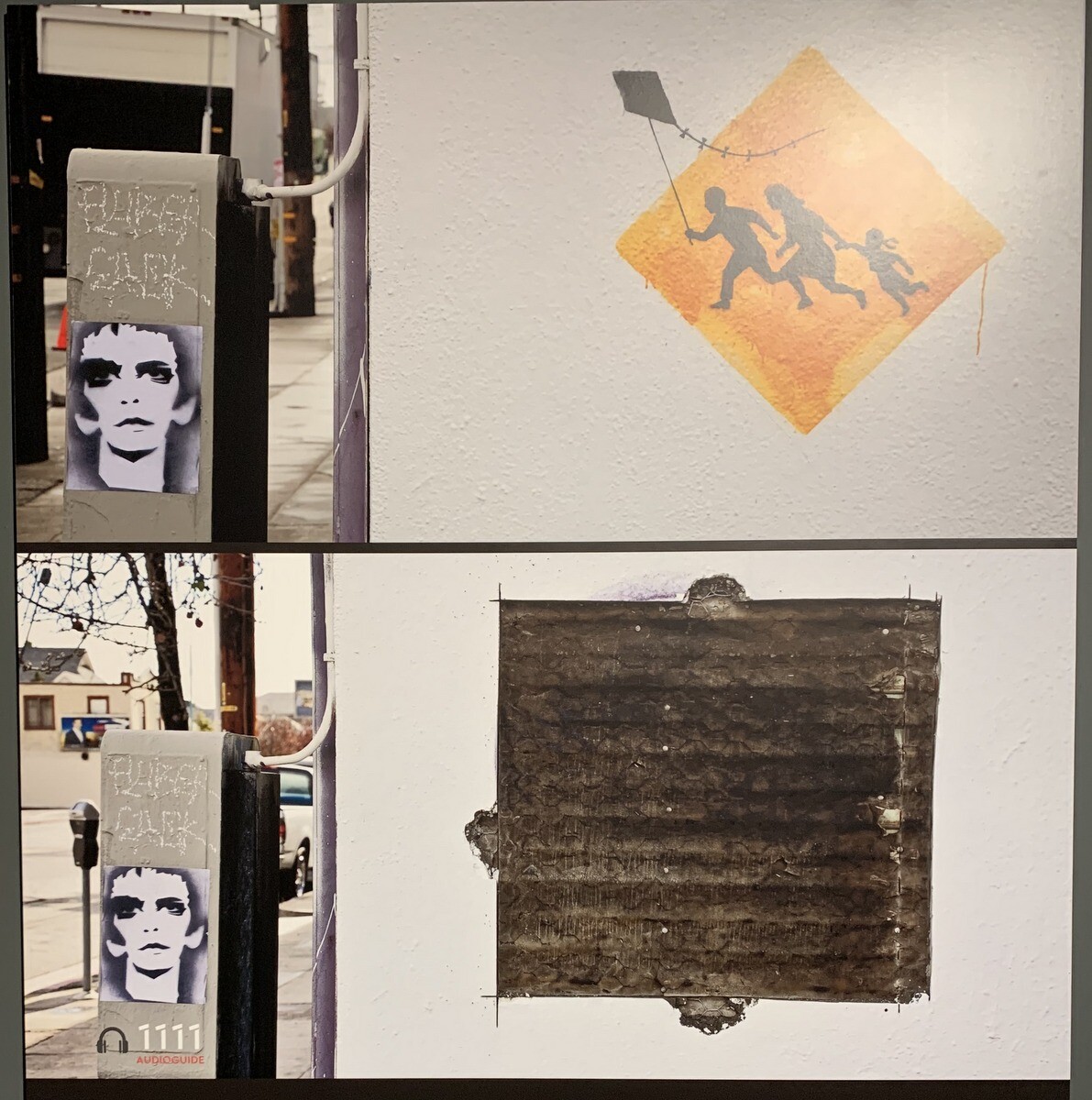 ●「カイト・ストーリー」2011年 ロサンゼルスで描かれた。道路標識は、メキシコ国境近くに設置されたもので、移民の家族が高速道路の横断を試みて死亡する事故が増加したことに端を発している。その道路標識にタコを描き加えた。しかし、塗りつぶされてしまった。市政当局や、競合するグラフィティ・グループや、ただ嫉妬心をもつ人たちに塗りつぶされたり、壁から切り取られて金儲けのために売られ、その一方で自然に崩れていくものもある作品の一例。
