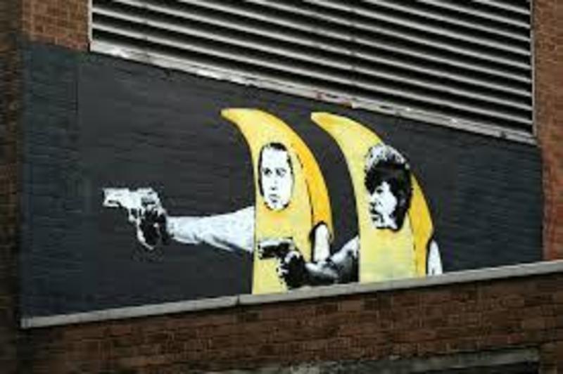 ●「パルプ・フィクション」クエンティン・タランティーノ監督作品「パルプ・フィクション」へのオマージュ。2002年オールド・ストリートの屋根の真下にある家に描き、2004年にバンクシーはこのイメージを用いてプリントを制作。