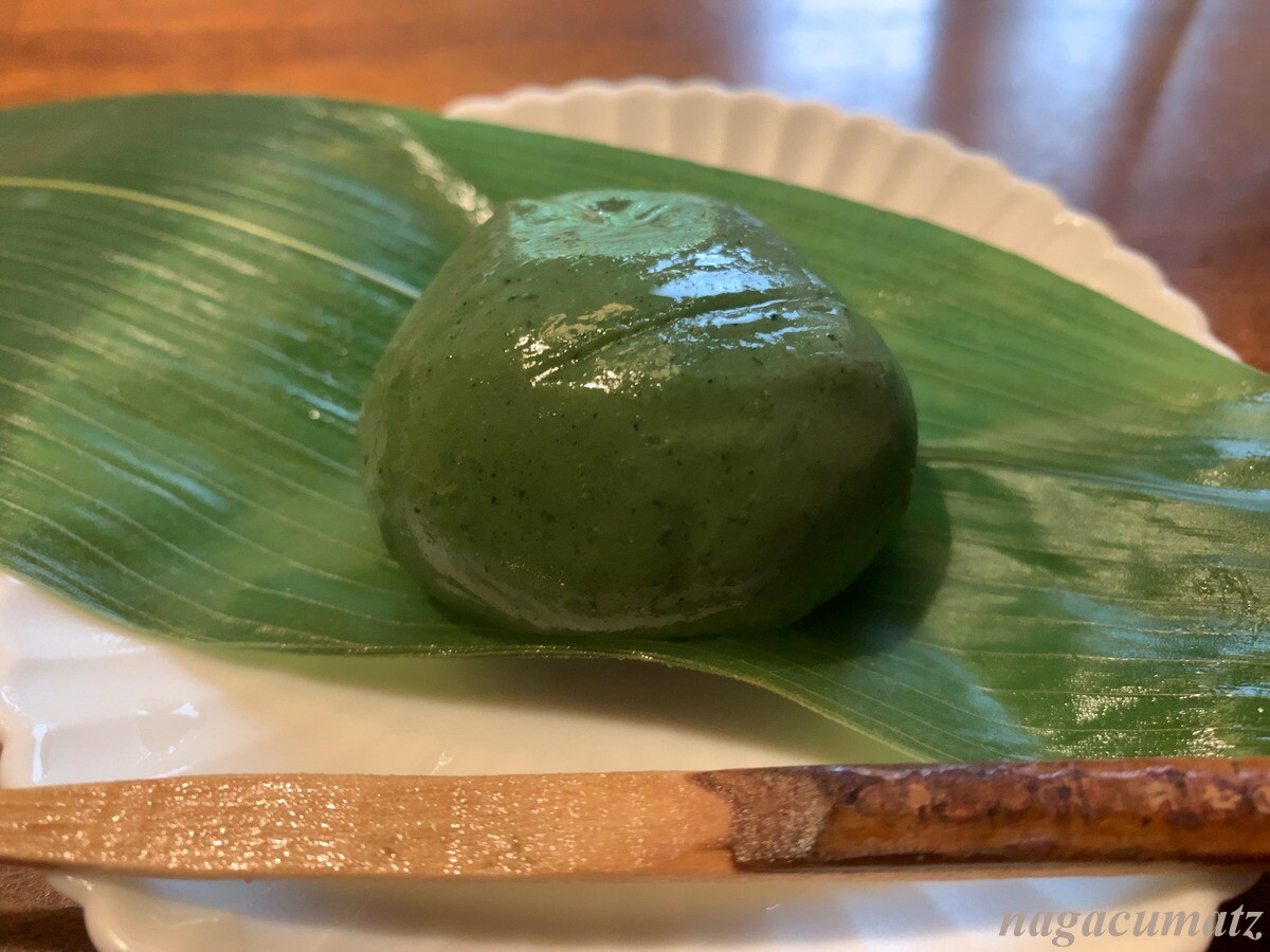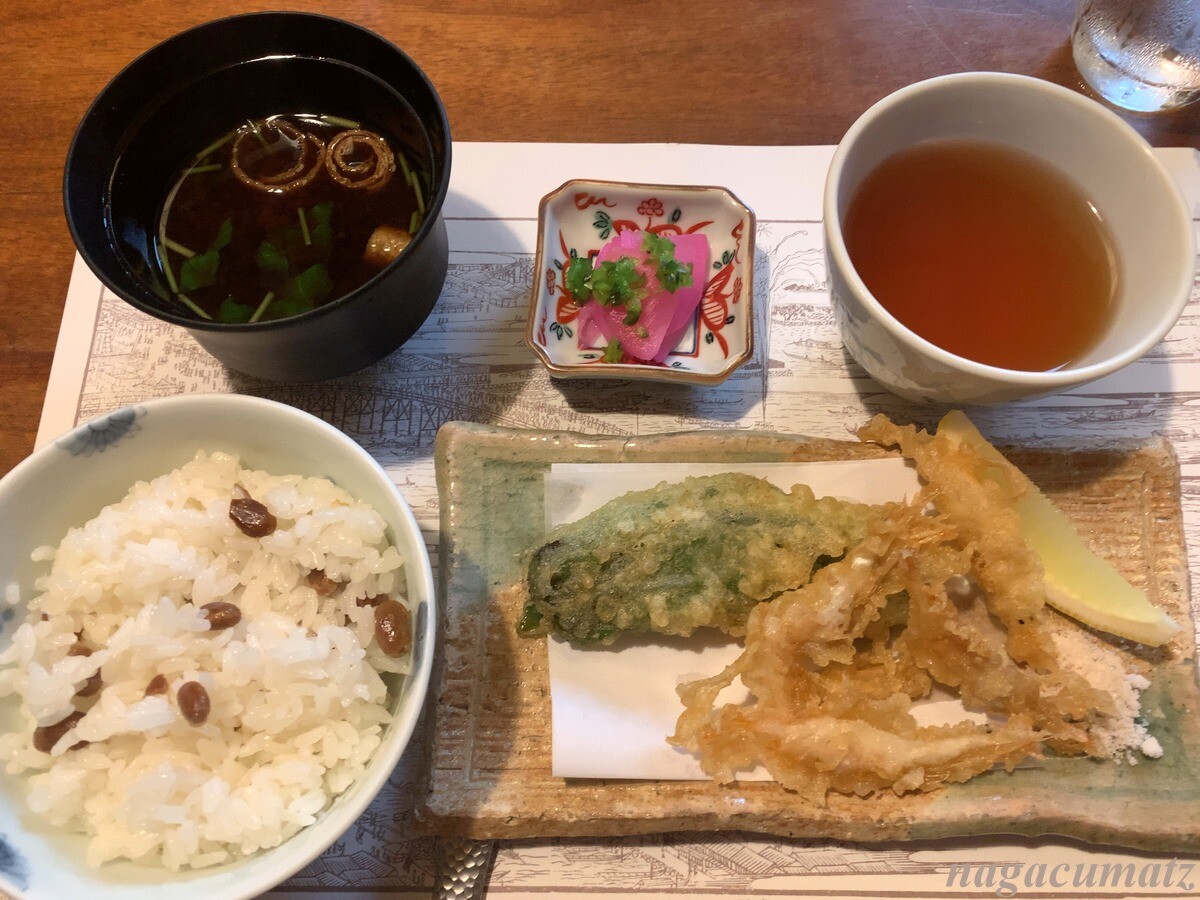 食事 豆ご飯、香の物、止め椀は赤出汁、お茶はおからから作られたおから茶水菓子 麩饅頭