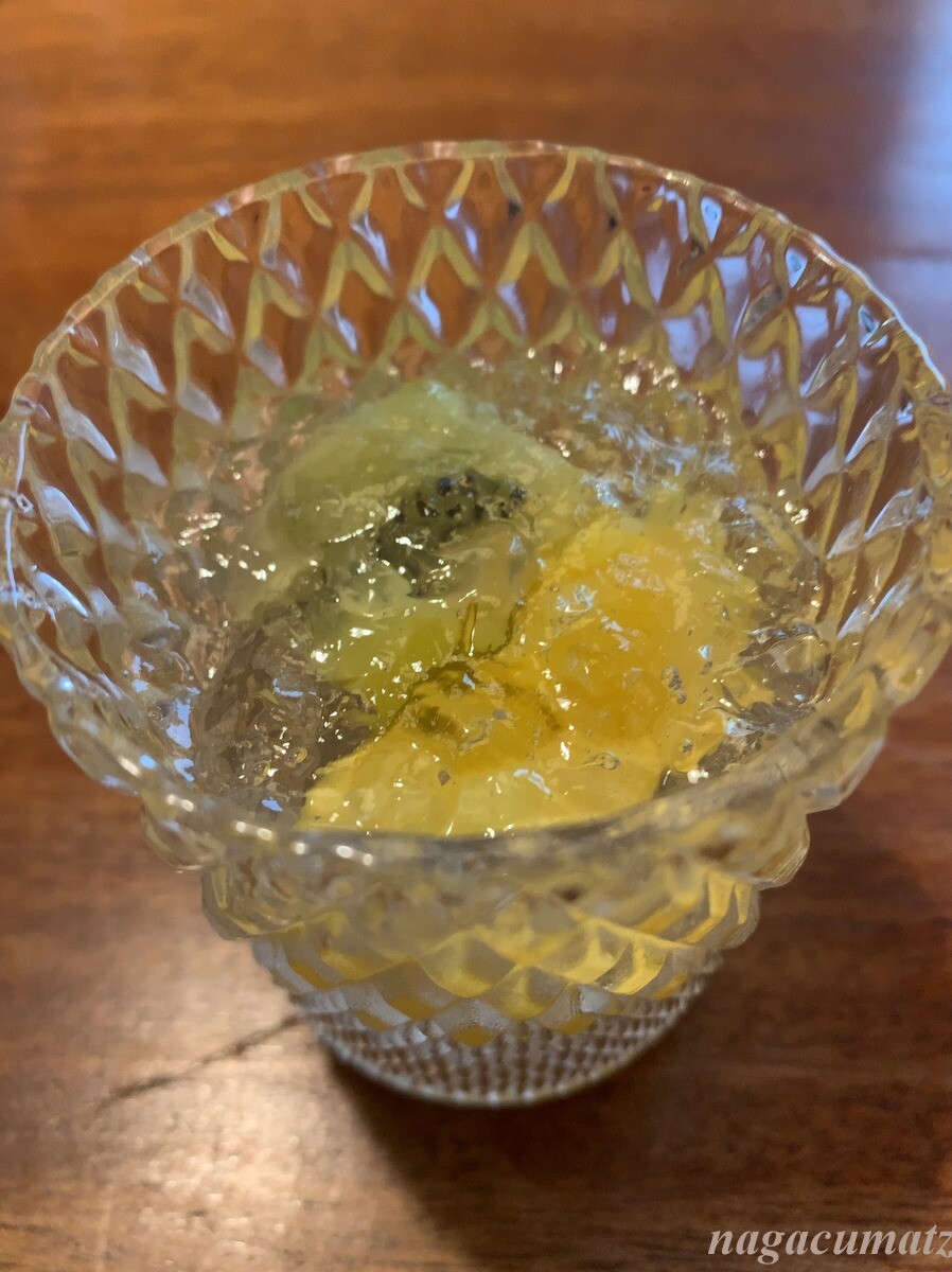 パイナップルとキウイに白ワインのジュレ我々は個室でいただいたのだが、緑を見ながら食べられるカウンター席もあった。