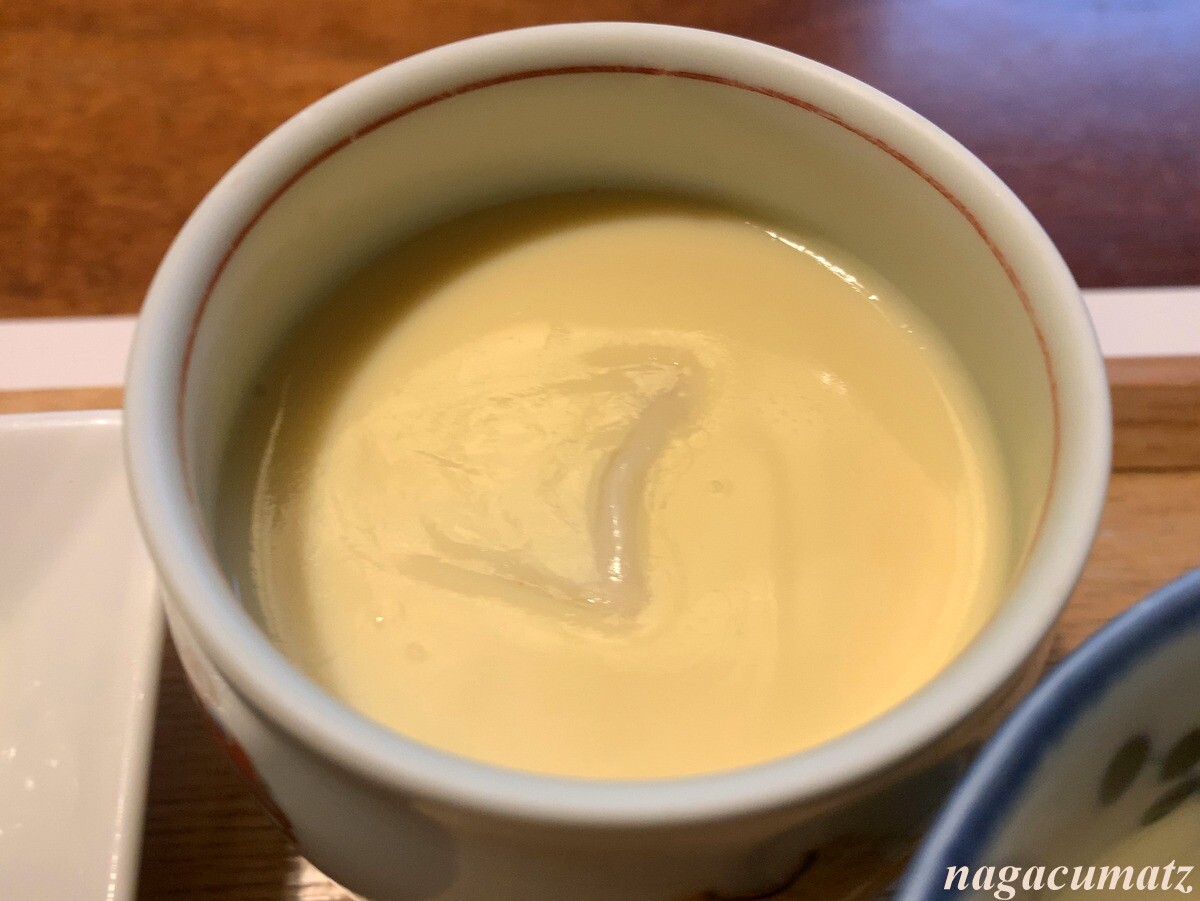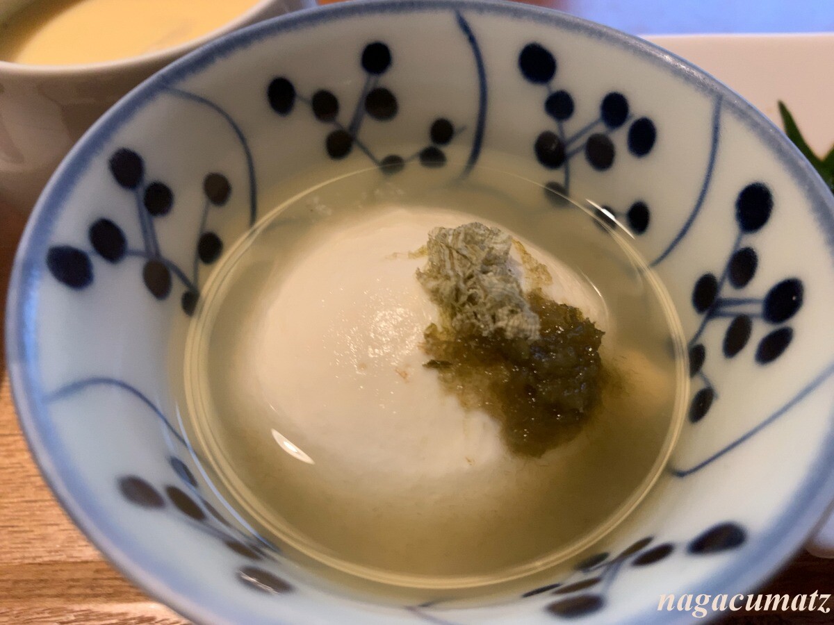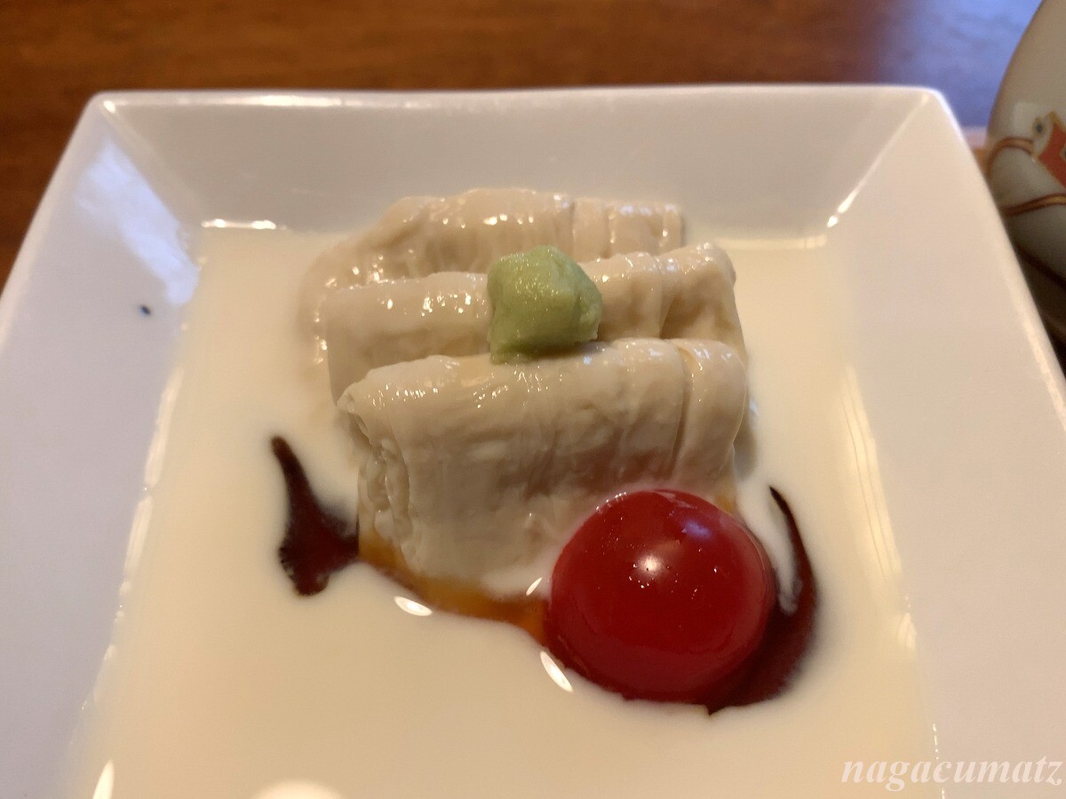 茶碗蒸し シンプルな茶碗蒸しかと思いきや、まるで求肥のような柔らかい胡麻豆腐が入っていて美味。友人ともどもすっかり気に入った。湯波刺し 濃厚で、豆乳も楽しめる。