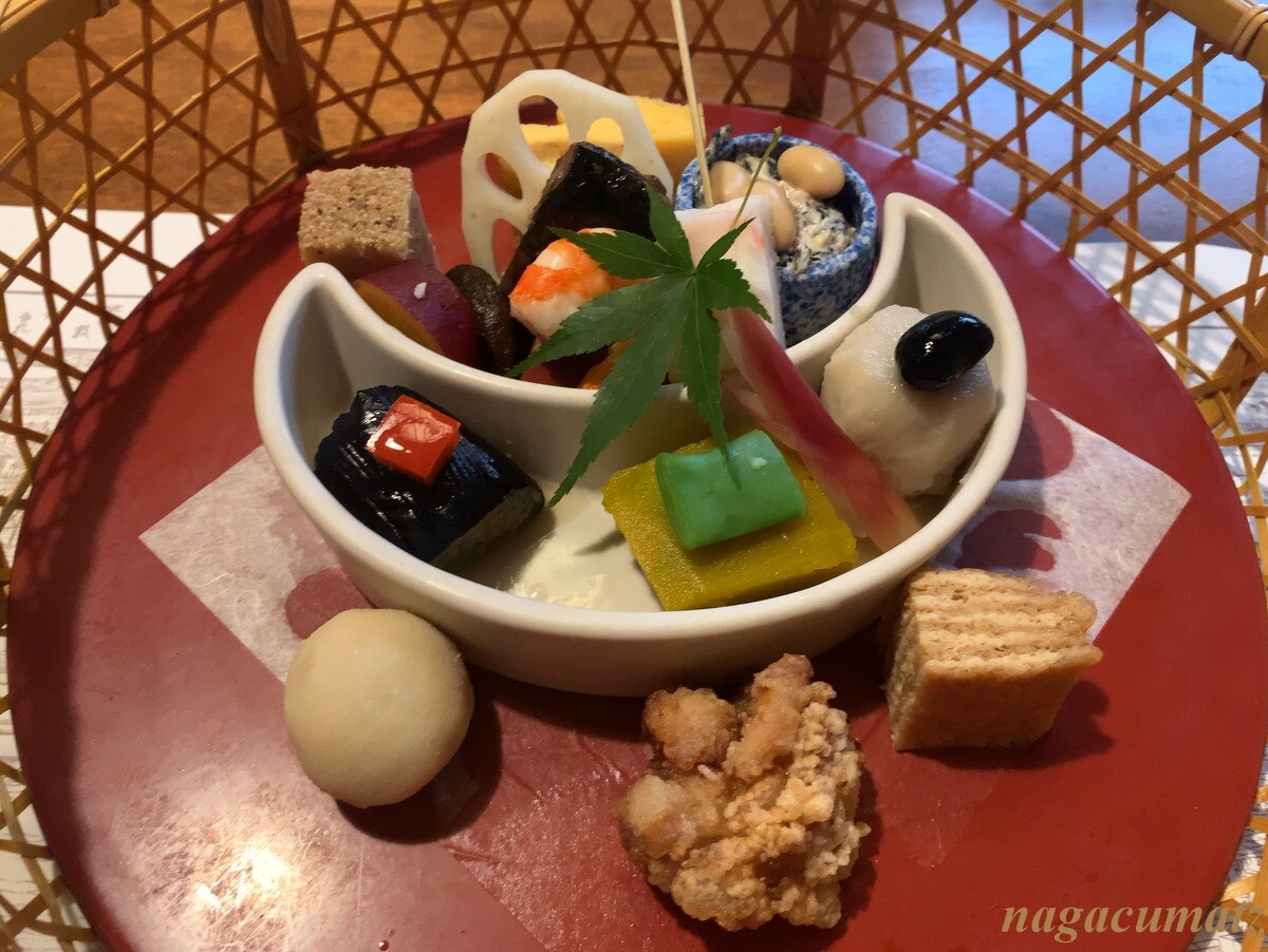 出汁巻玉子、鰊甘露煮、茄子、隠元、松風、丸十、酢取り蓮根、蟹真丈、南瓜など。色々な物を少しずつで、お酒も進む。