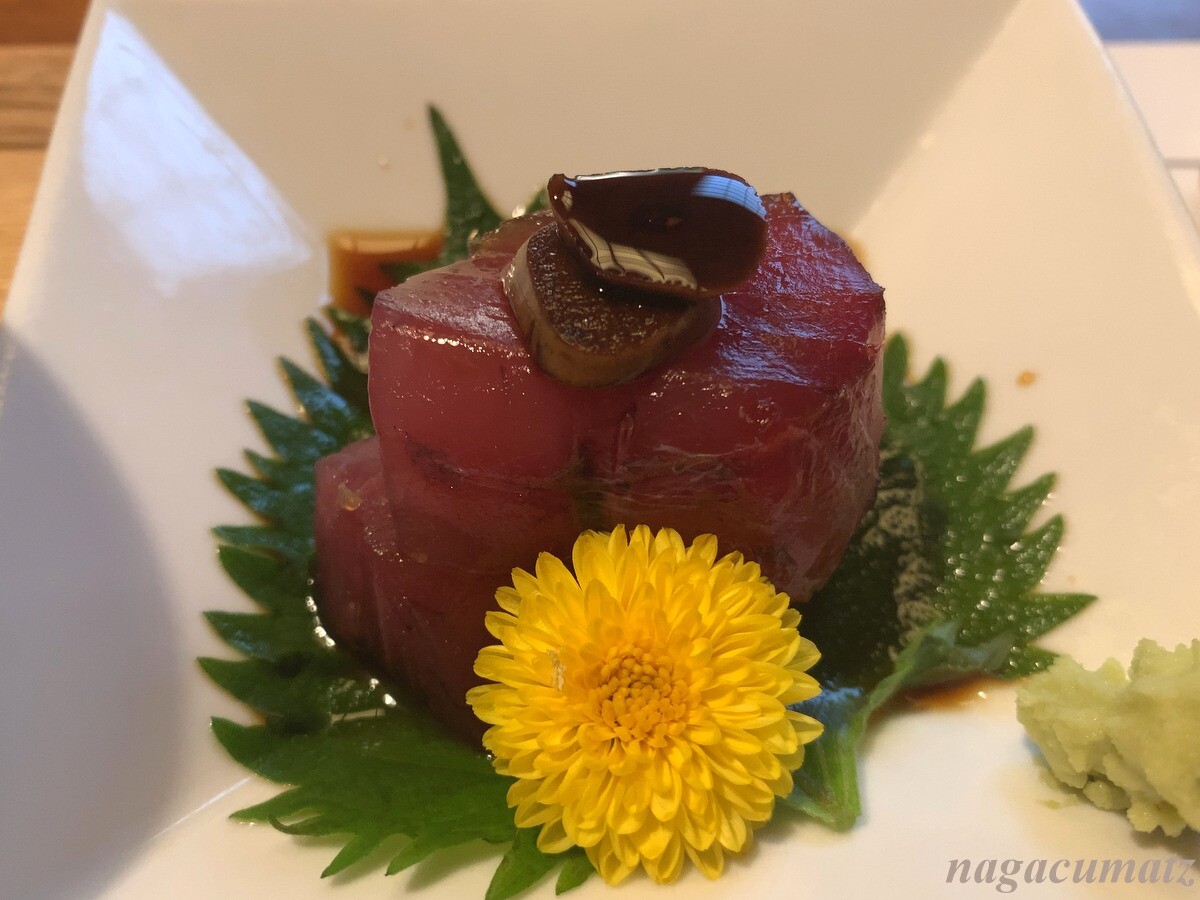 お造り 鰹の上には醤油漬けのにんにくが乗る。