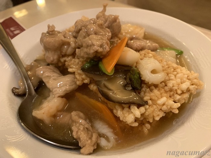 目の前でおこげにスープや具をかけてもらう。