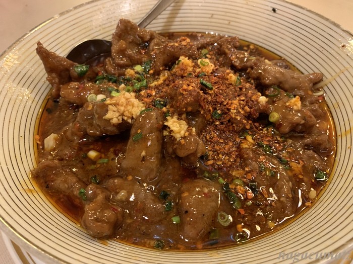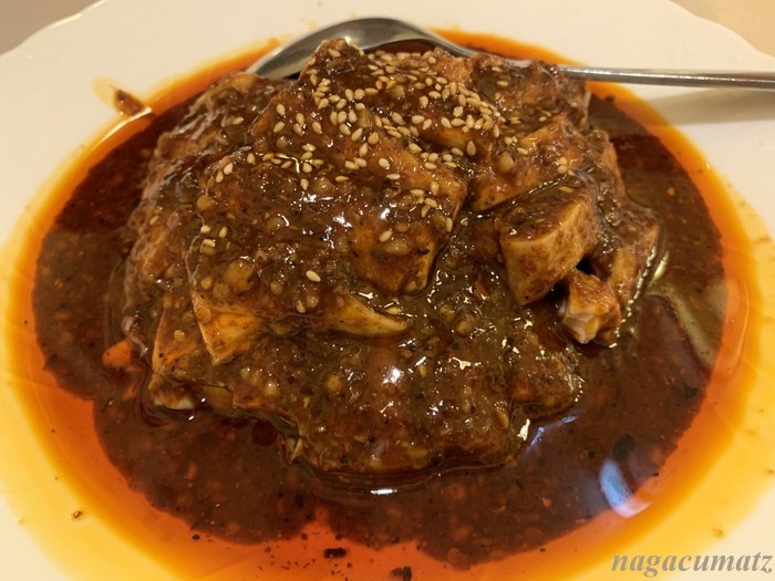 よだれ鶏 1625円 山椒の麻と、唐辛子の辣とが、良い感じ。一番辛い唐辛子マーク3個のメニューで、おそらく少しお手柔らかになっているのだろうが、山椒の麻が利いていて気に入った。画像にはないが、鶏肉の下にネギが敷いてあり、それがすっきり良い感じ。