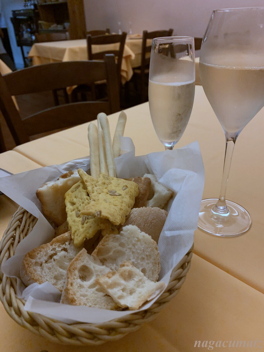 フランチャコルタのブリュット1100円、プロセコ700円。席料はひとり500円だが、パンが各種つく。