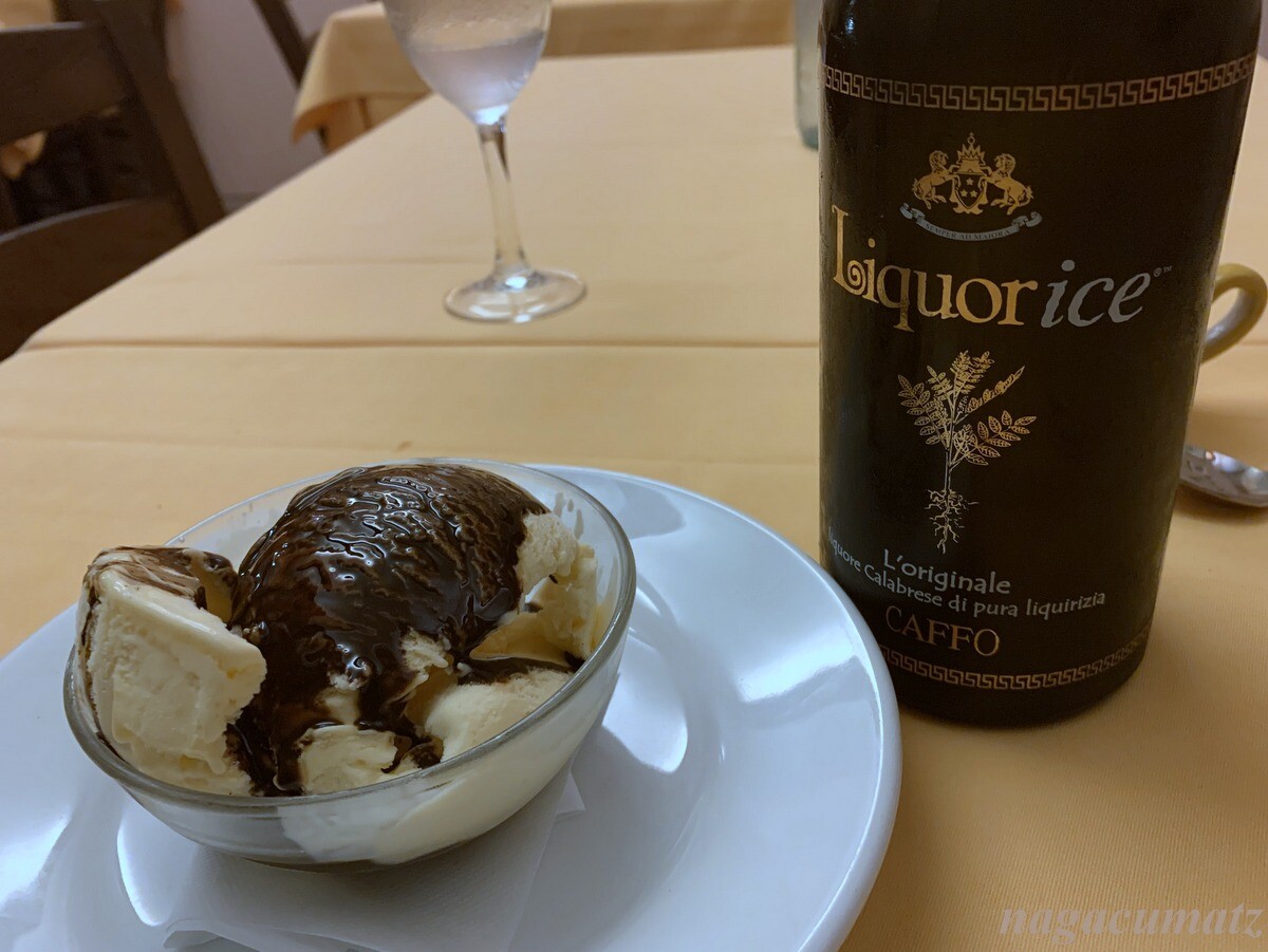 バニラアイスのリコリス酒かけ 1000円。濃厚なリコリスのリキュールで、独特の風味はすっきりと感じさせてくれる。