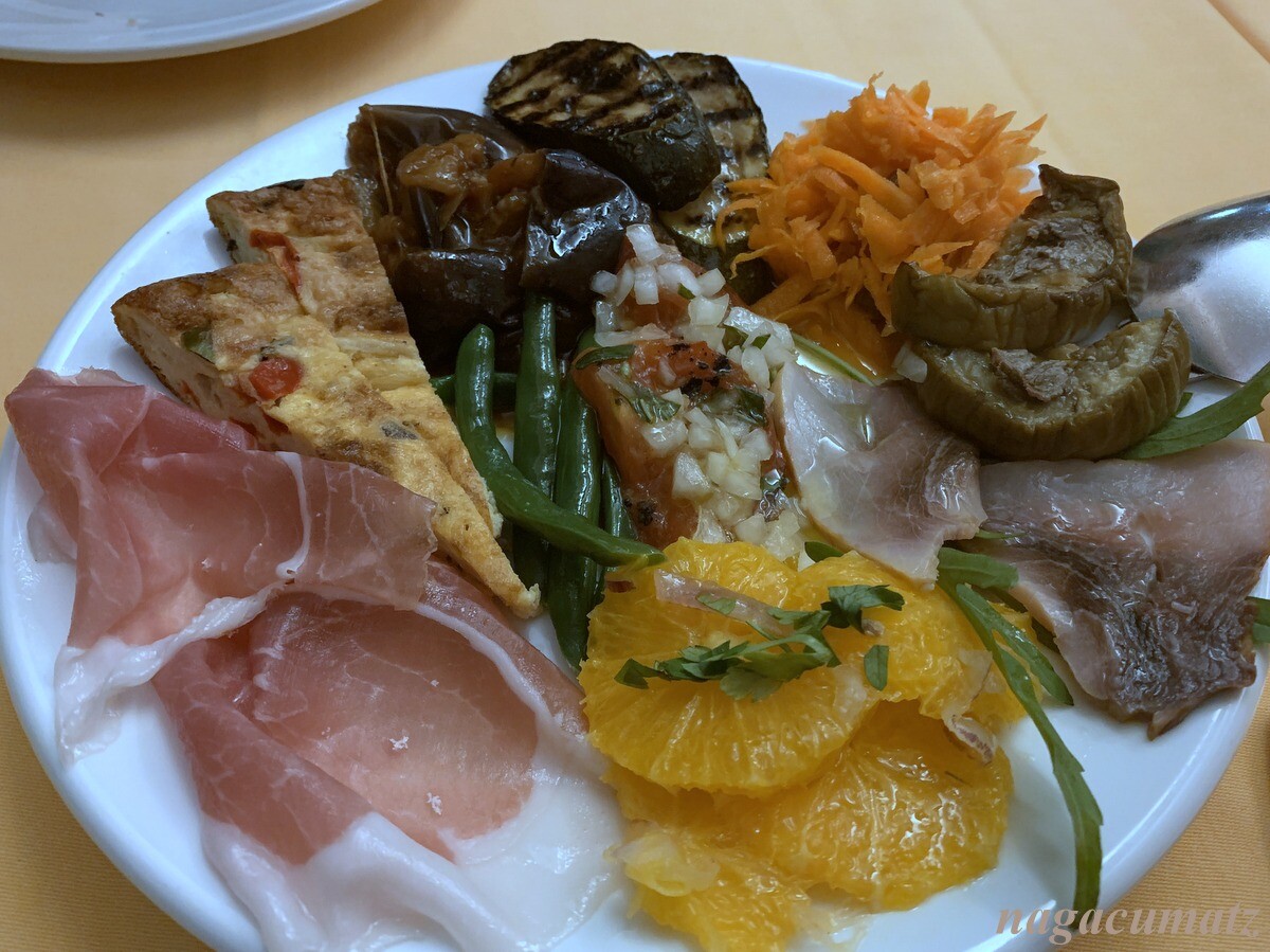 生ハムから時計周りに、フリッタータ、ナスのカポナータ蜂蜜仕立て、グリルしたズッキーニのマリネ、人参とレーズン、ナスとアンチョビ、カジキマリネの燻製、オレンジ、中央にトマト、インゲン。