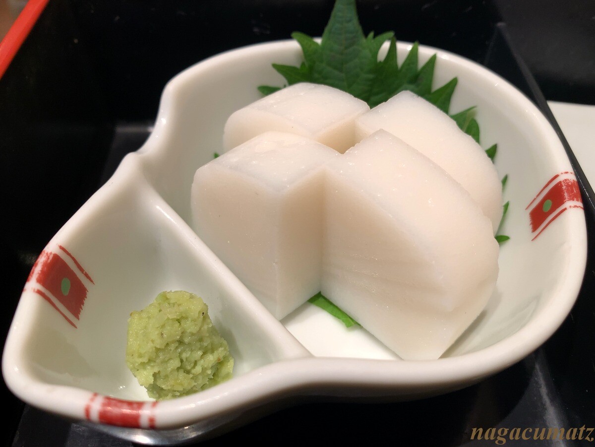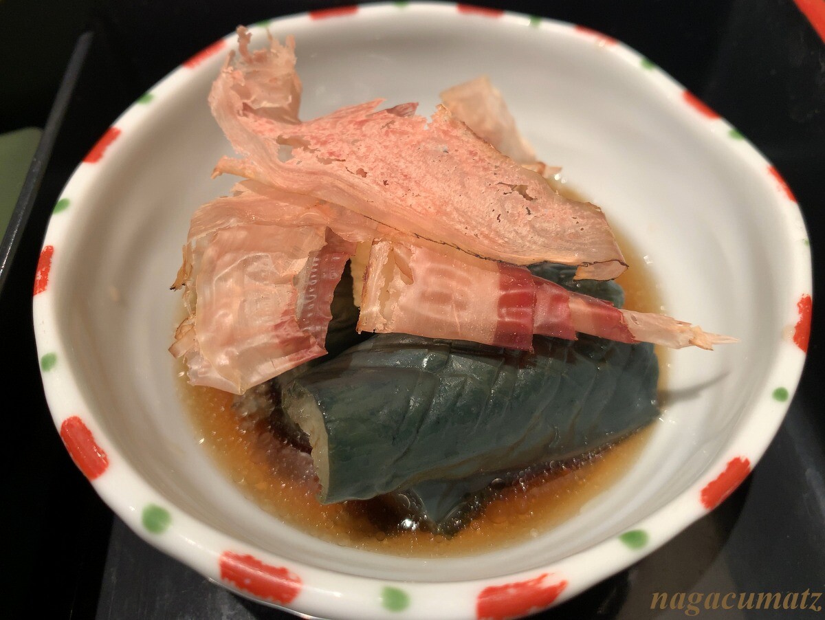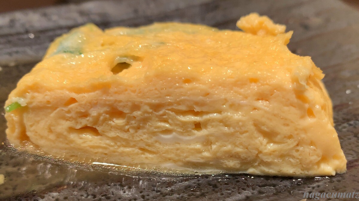 出汁巻き玉子焼きには、三つ葉が入り、ほんのり甘め。オムレツ風ではなく、ちゃんと巻いてあるのだが、とても柔らかくていける。