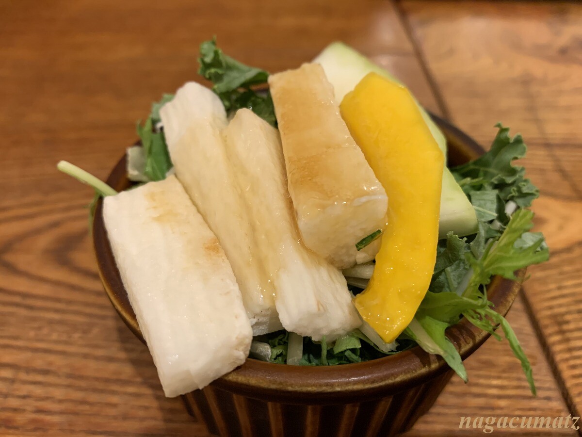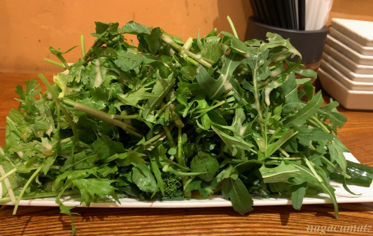 パクチー、ルッコラ、クレソン、水菜などなど葉野菜盛り。右にちらりと見えているが、キュウリの和え物が下に。950円 これこそてんこ盛りで、少しでも横から取ろうものなら、崩れてしまう💦