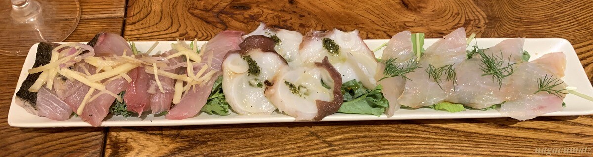 カルパッチョ3種盛りには、マヒマヒ(=シーラ)、水蛸、コロダイ(胡廬鯛)950円 それぞれにお味が付けてある。