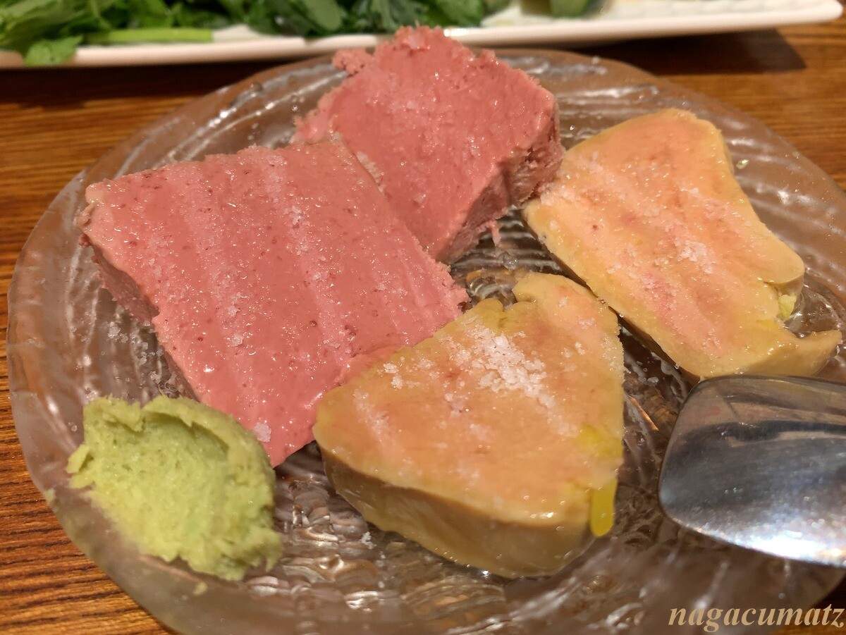 左が白レバー、右がフォアグラ。上に蜂蜜と岩塩がかかっていて、これはいつ食べても美味。750円。
