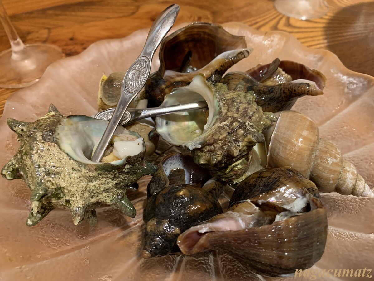 貝3種盛りには、姫サザエ、黒ばい貝、つぶ貝 980円。