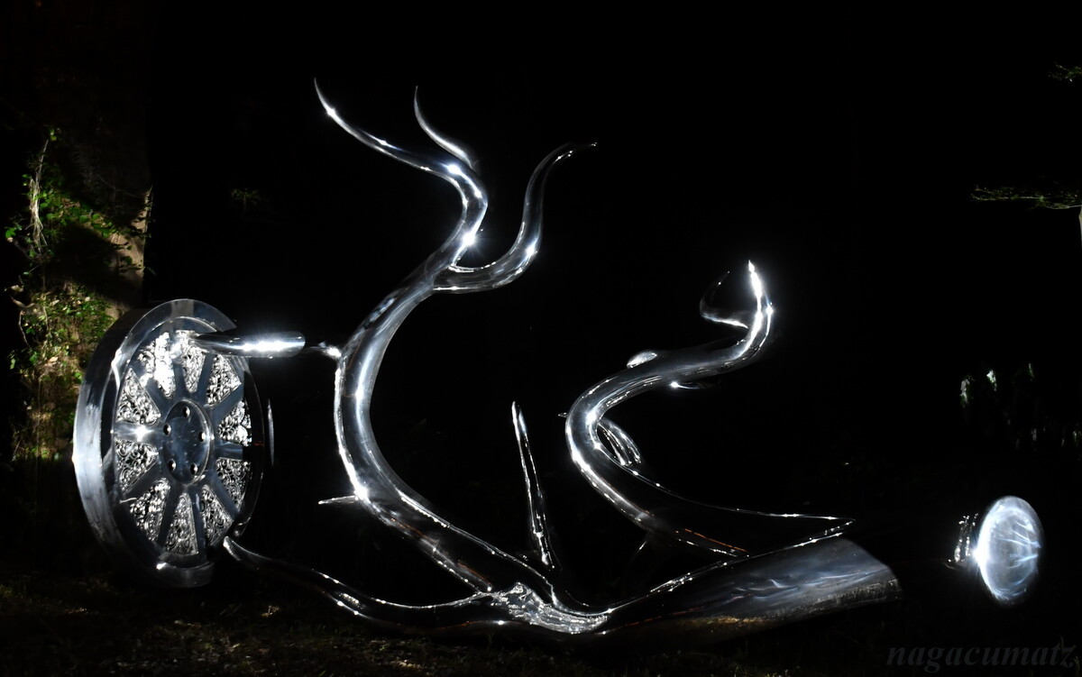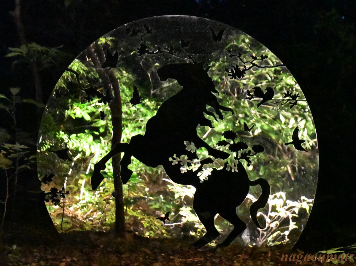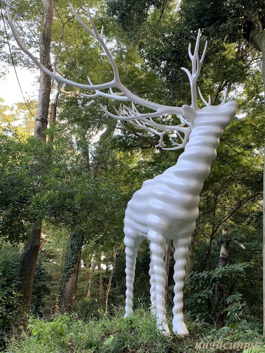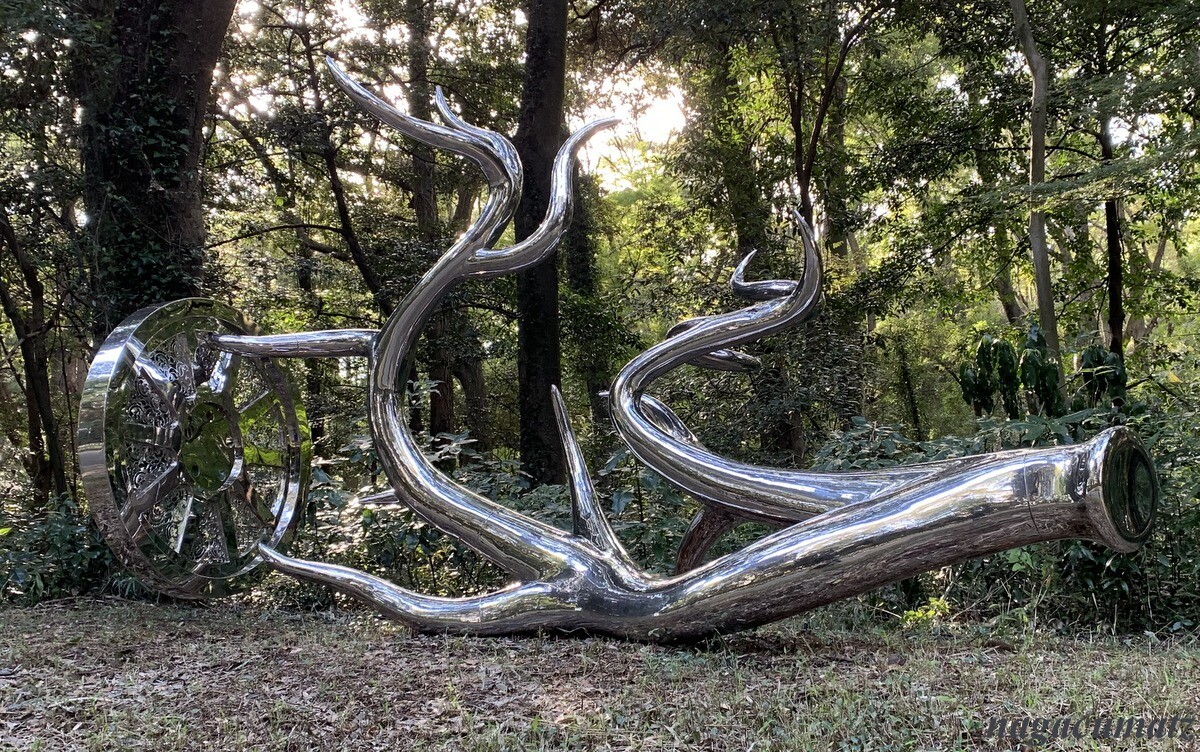 ステンレスミラーの作品。明治天皇は愛馬の金華山号を溺愛し、剥製として残したぐらい。その金華山号が題材になっている。ステンレスミラーの部分は道行く人が映り込み、馬などのモチーフはステンレスミラーからカットされているので、モチーフを通して向こうの森が見える。楽園をテーマにし、境界を感じさせる作品なのだそう。人が多く通る参道から少し離れた道の、しかもうっそうとした森の中に置かれているので、作品の名前などを示すボードがなければ通り過ぎてしまったかも、と言うぐらい目立たない💦