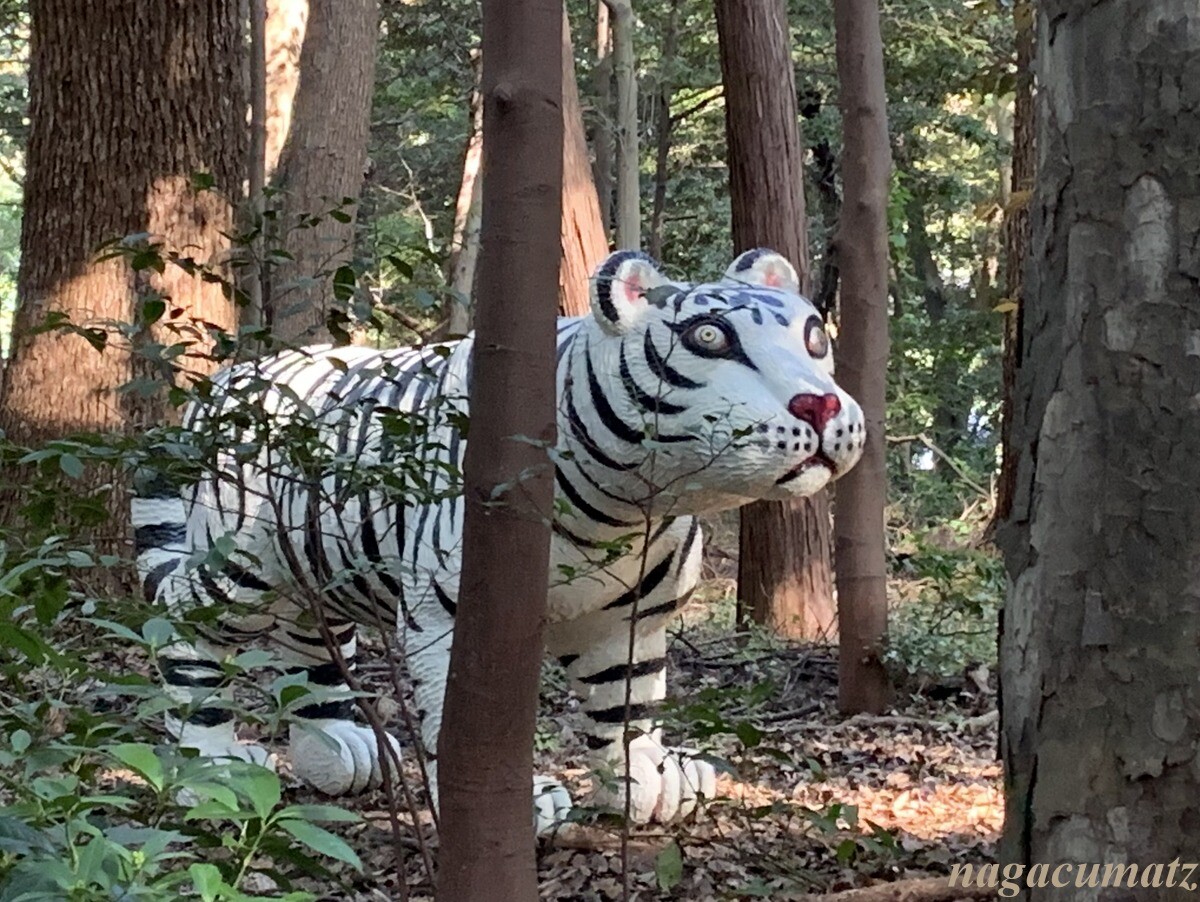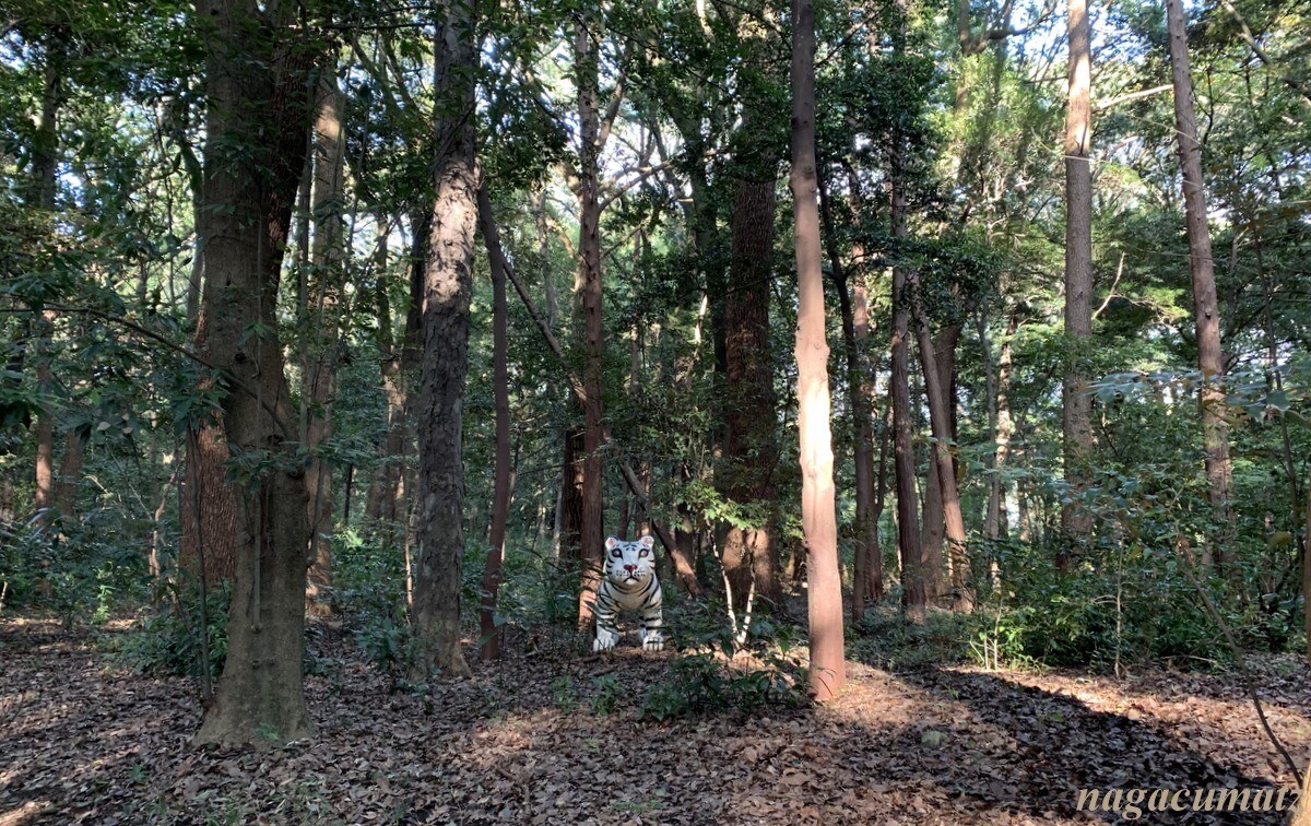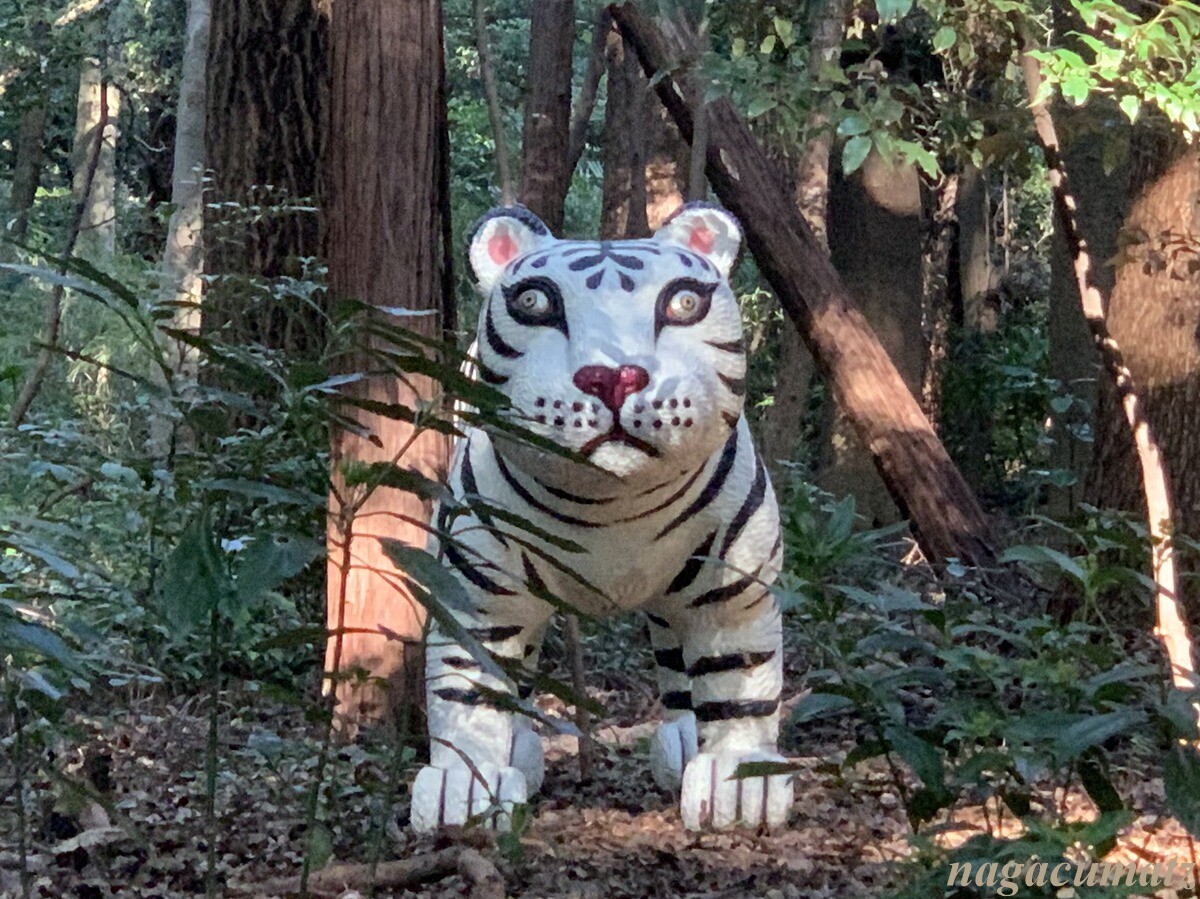 等身大の動物木彫作家の白虎。木彫のオリジナルがあるが、長く展示する為にブロンズ製となっている。彫刻の材質には堅い楠を使用するので、楠が多く生えている場所にあえて設置。虎の顔の向きは、本殿の方を向くのは三沢氏曰く畏れ多いとのことで、清正井(きよまさのいど)の方を向いている。三沢氏の彫刻は、2010年のあいちトリエンナーレで熊の作品を見て以来。その様子は こちら