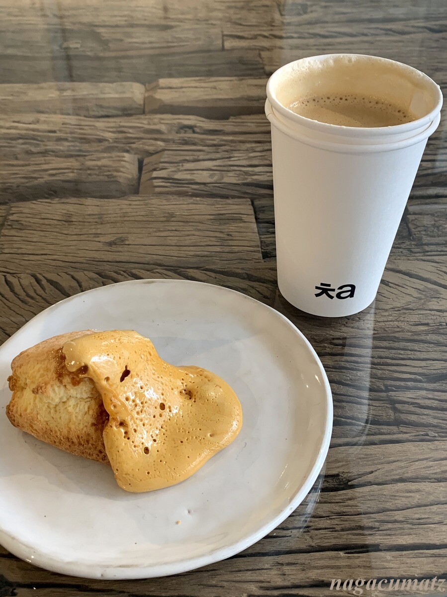 アッサムのタルゴナミルクティーの濃いめを。648円。冷めると、タルゴナが下に沈んで甘くなると言われたが、混ぜてほどよく頂いた。タルゴナスコーン(プレーン)270円。スコーンに上にかかっているのがそのタルゴナ。確かに甘い!