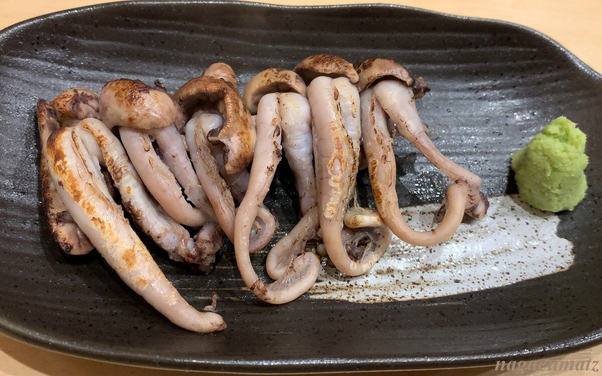 肝わさ 750円 肝臓本体と管を湯がいて、さっと炙ってあるものを山葵醤油でいただく。