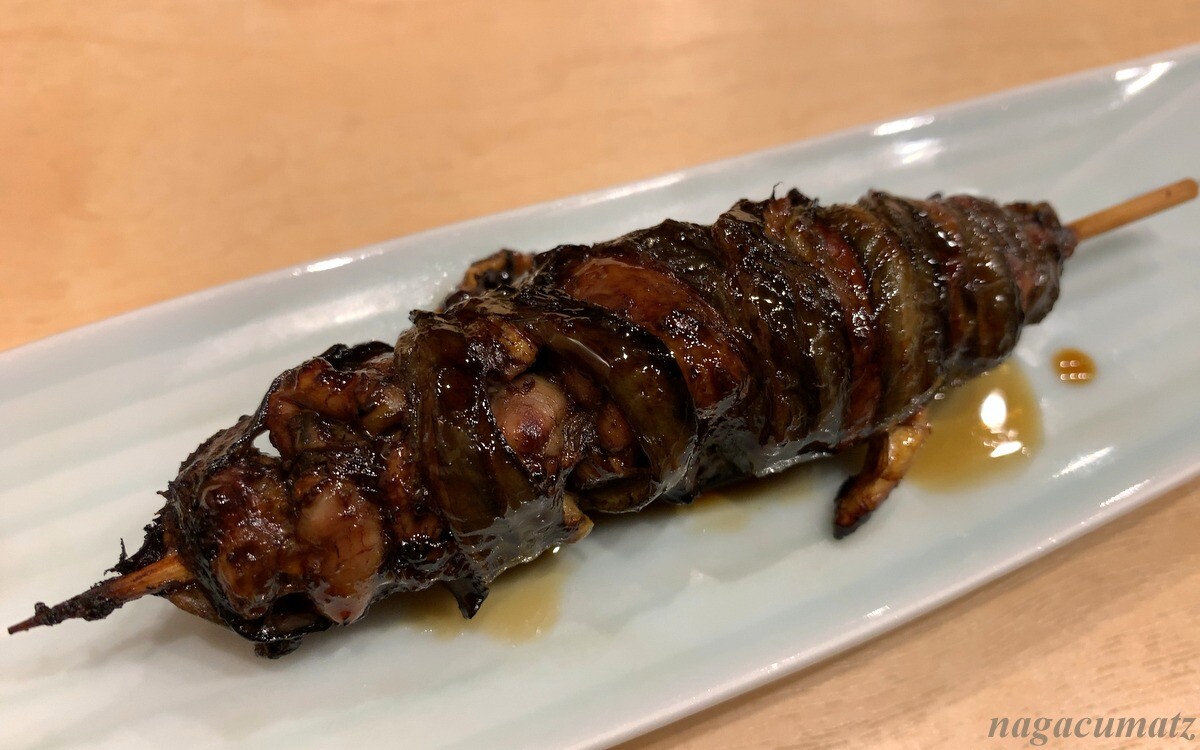 肝焼き 700円 串にいわゆるレバーの部分と管や皮紐のような内臓部分などを巻いて焼いてある。