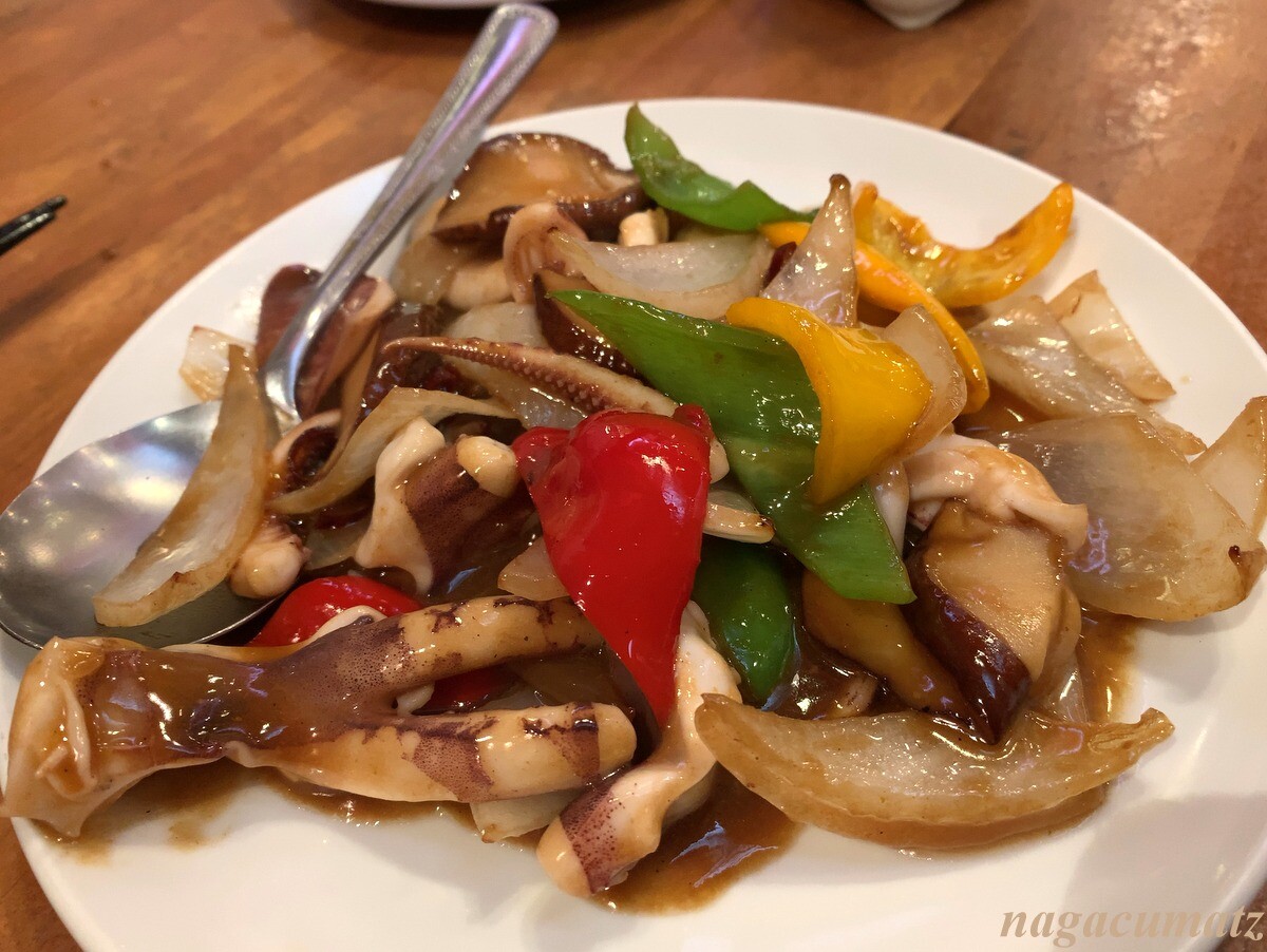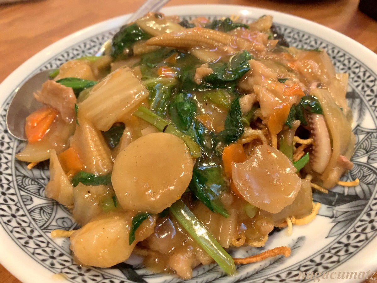 炒飯をお願いしたのだが、既にランチの時点で完売で、堅焼きそばなら出来るとのこと。堅焼きそばも大好きなので、それを。いかげそ、海老、豚肉、ヤングコーンなども入るが、クワイのショリショリ感が良い。