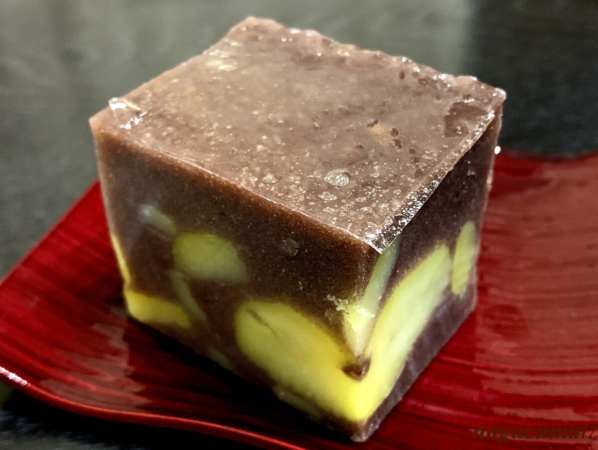 栗蒸し羊羹のカット 290円 上にうっすら寒天が乗っている。1年に1日だけ販売される(昨年秋は2日だったが)清寿軒の栗蒸し羊羹の方が(その様子は こちら )がゴロゴロ入っているが、こちらの栗は清寿軒の栗の甘露煮ほどの甘さがなく、小豆とのコラボが良い感じ。