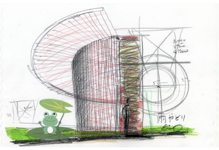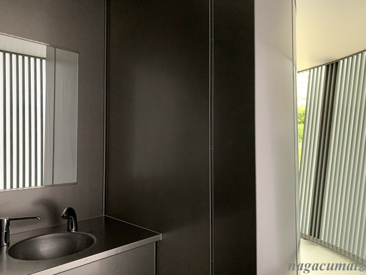 安藤忠雄 氏のトイレは、その名も「雨やどり」。南側と北側の両側から入り口がある。南側の庇の方が長い。