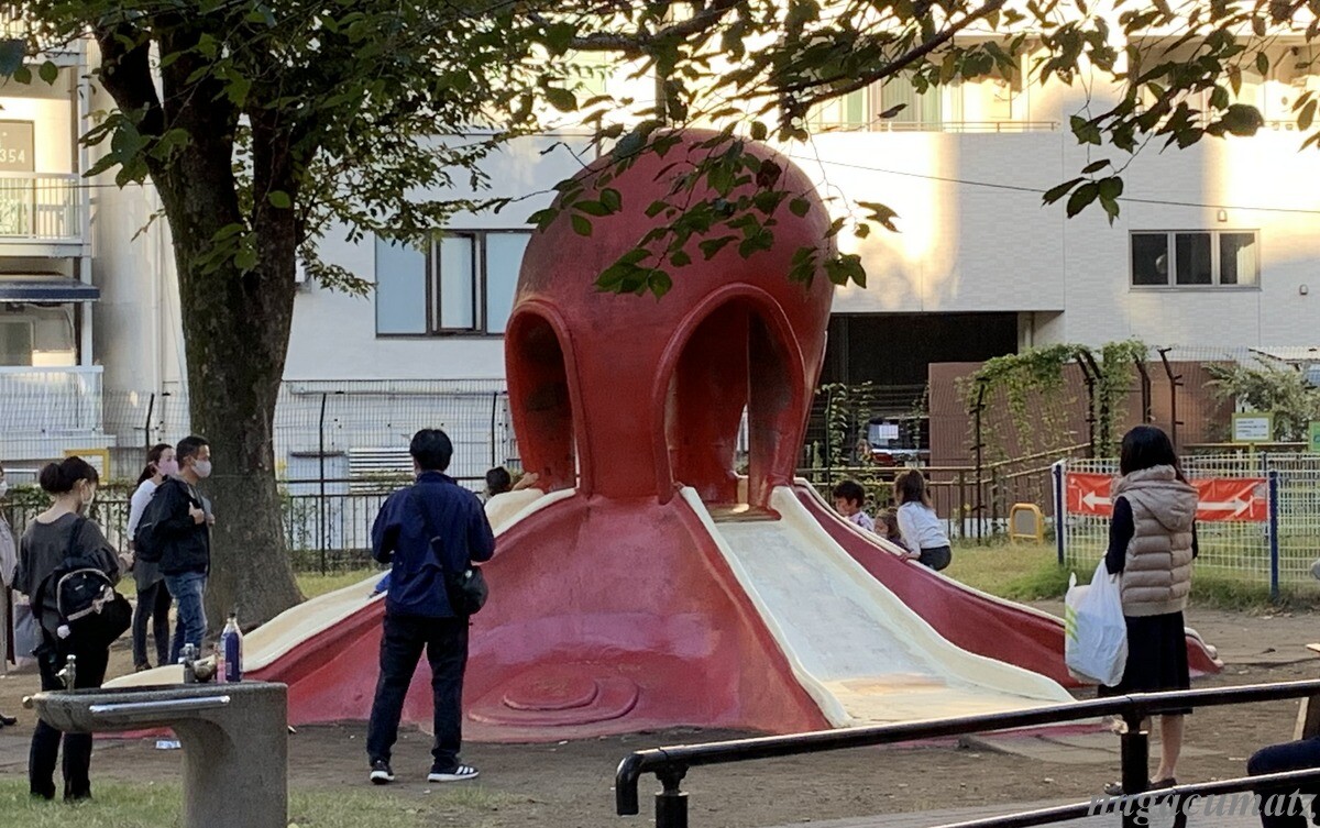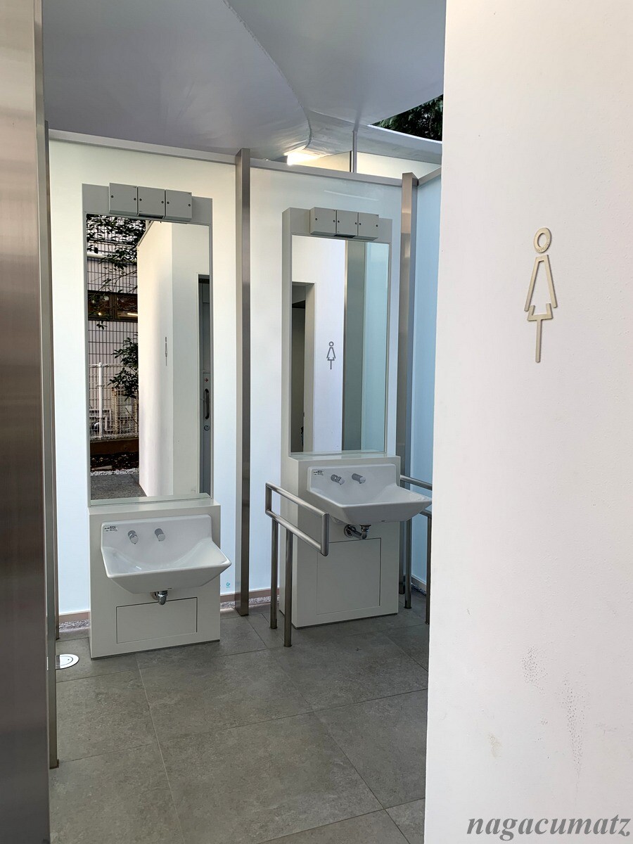 恵比寿東公園は児童遊園で、タコの遊具があることから「タコ公園」とも呼ばれていることから、「イカのトイレ」と。単なるパブリックトイレとしてだけでなく、休憩所を備えた公園内のパビリオンとして機能する公共空間としたいと考え、屋根は通風を促し自然光を呼び込む形態とし、明るく清潔な環境と同時に、公園内の遊具のようなユニークな姿を生み出すことを意図されたとのこと。ベンチまで付いているのも面白い。